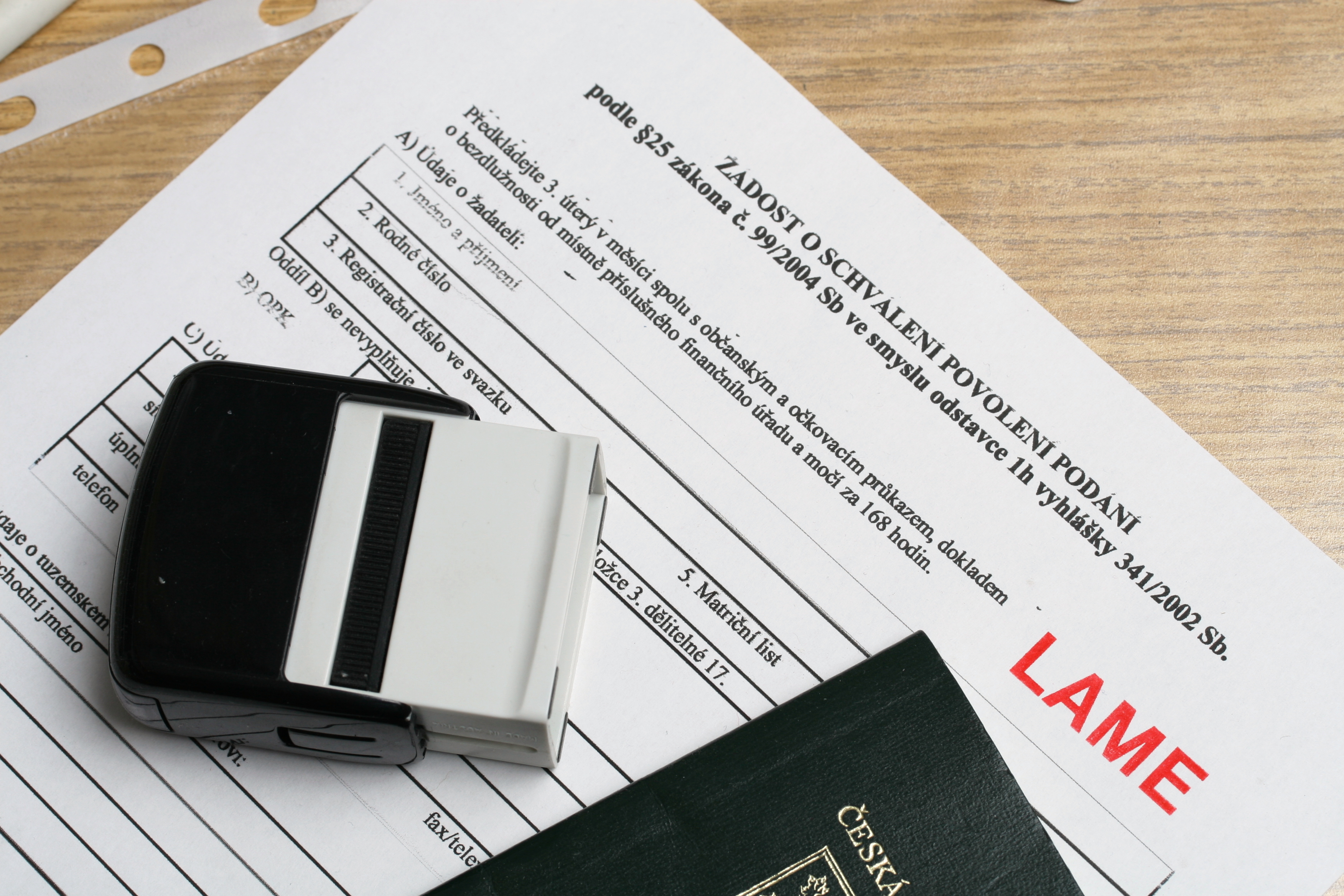 • Čeština: Ilustrační fotografie k tématu byrokracie. Formulář je fiktivní. Žádost o schválení povolení podání podle §25 zákona č. 99/2004 Sb ve smyslu odstavce 1h vyhlášky 341/2002 Sb. (Zákon č. 99/2004 Sb. je zákon o rybářství a § 25 se týká povinnosti zaměstnanců orgánů státní správy rybářství nosit při výkonu funkcí jednotný služební stejnokroj včetně služebního odznaku. Vyhláška 341/2002 Sb. je vyhláška o schvalování technické způsobilosti a o technických podmínkách provozu vozidel na pozemních komunikacích (nahrazená v roce 2015) a formát citace uvedený v záhlaví fiktivního formuláře je nesmyslný, žádný „odstavec 1h“, navíc bez údaje o paragrafu, v této vyhlášce nelze identifikovat – písm. h) v § 1, který se nečlení na odstavce, obsahuje definici osvědčení o homologaci typu ES.)