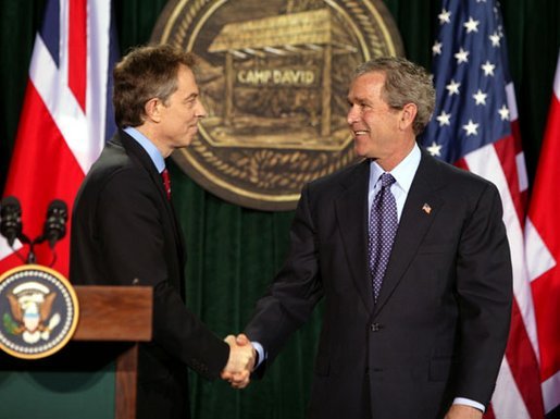 Fotografie + Description: Then Prime Minister of the United Kingdom, Tony Blair shaking hands with President of the United States, George W. Bush, after they conclude a joint news conference at the Camp David