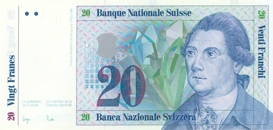 Fotografie + English: Front of the 20 Swiss Francs banknote, part of series 7 of Swiss banknotes. See http://www.snb.ch/en/iabout/cash/history/id/cash_history_serie7 for more information.