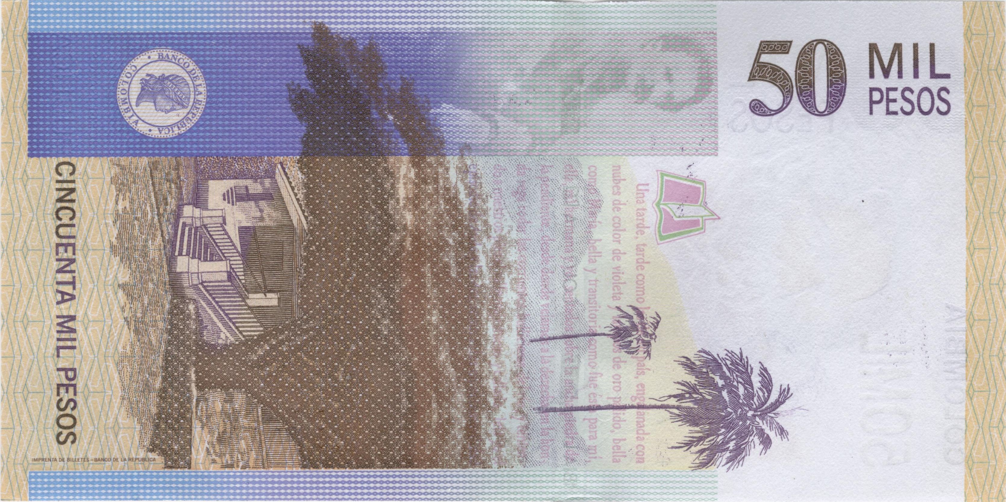 - Español: Reverso de un billete de 50000 pesos colombianos.