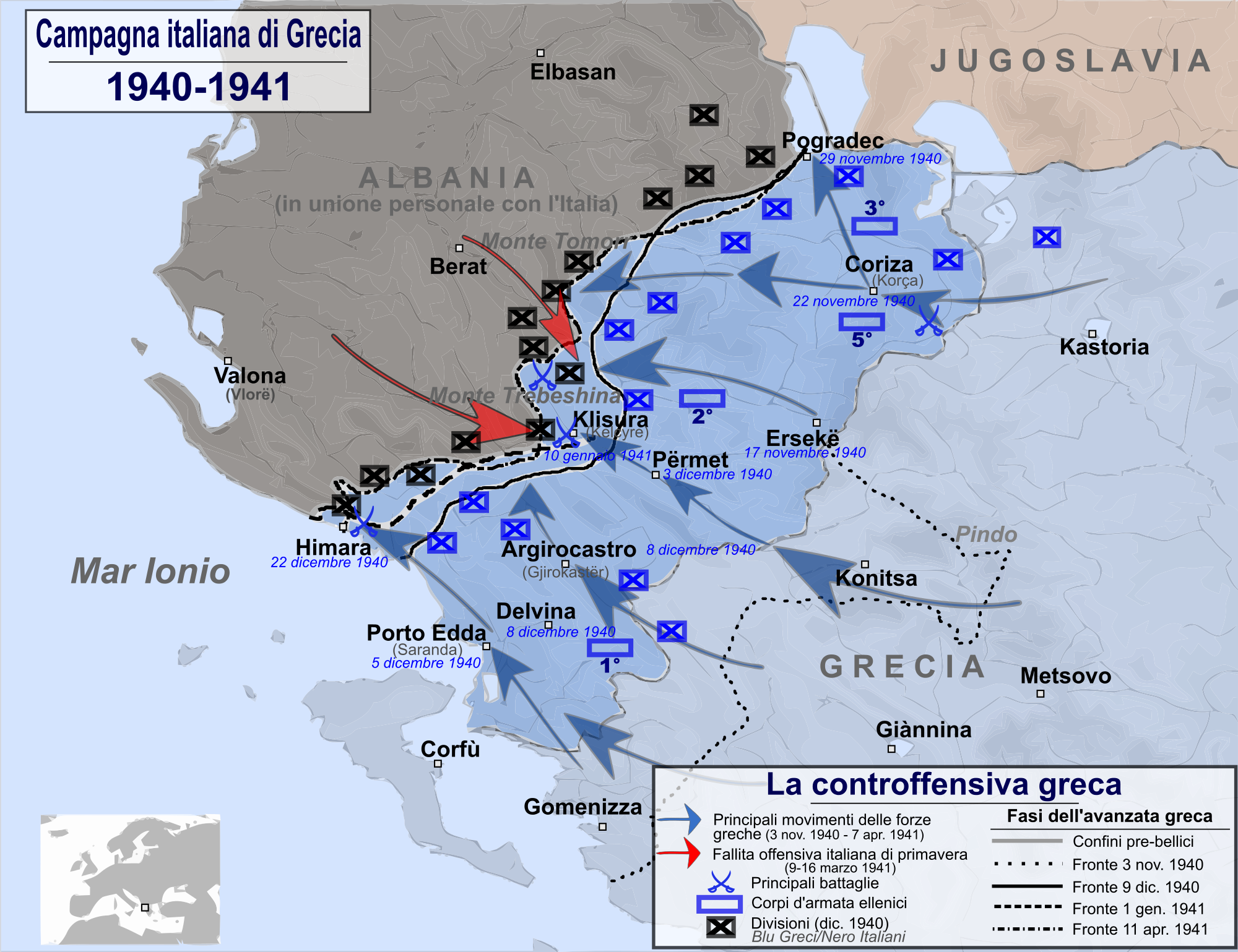 Historická mapa + Italiano: La controffensiva greca durante la guerra greco-italiana (13 novembre 1940-7 aprile 1941).