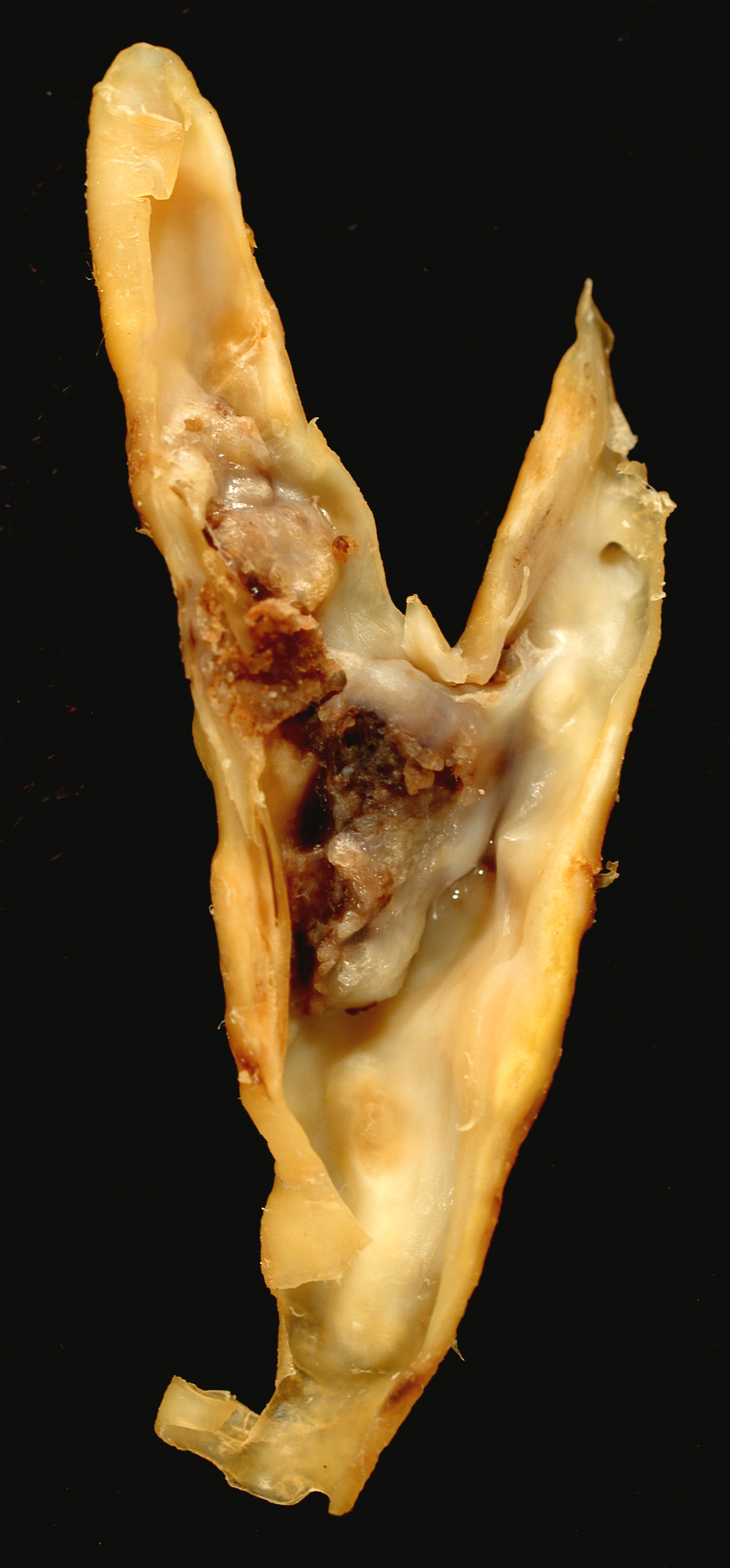 - Atherosclerotic plaque from a carotid endarterectomy specimen. This shows the bifurcation of the common into the internal and external carotid arteries.