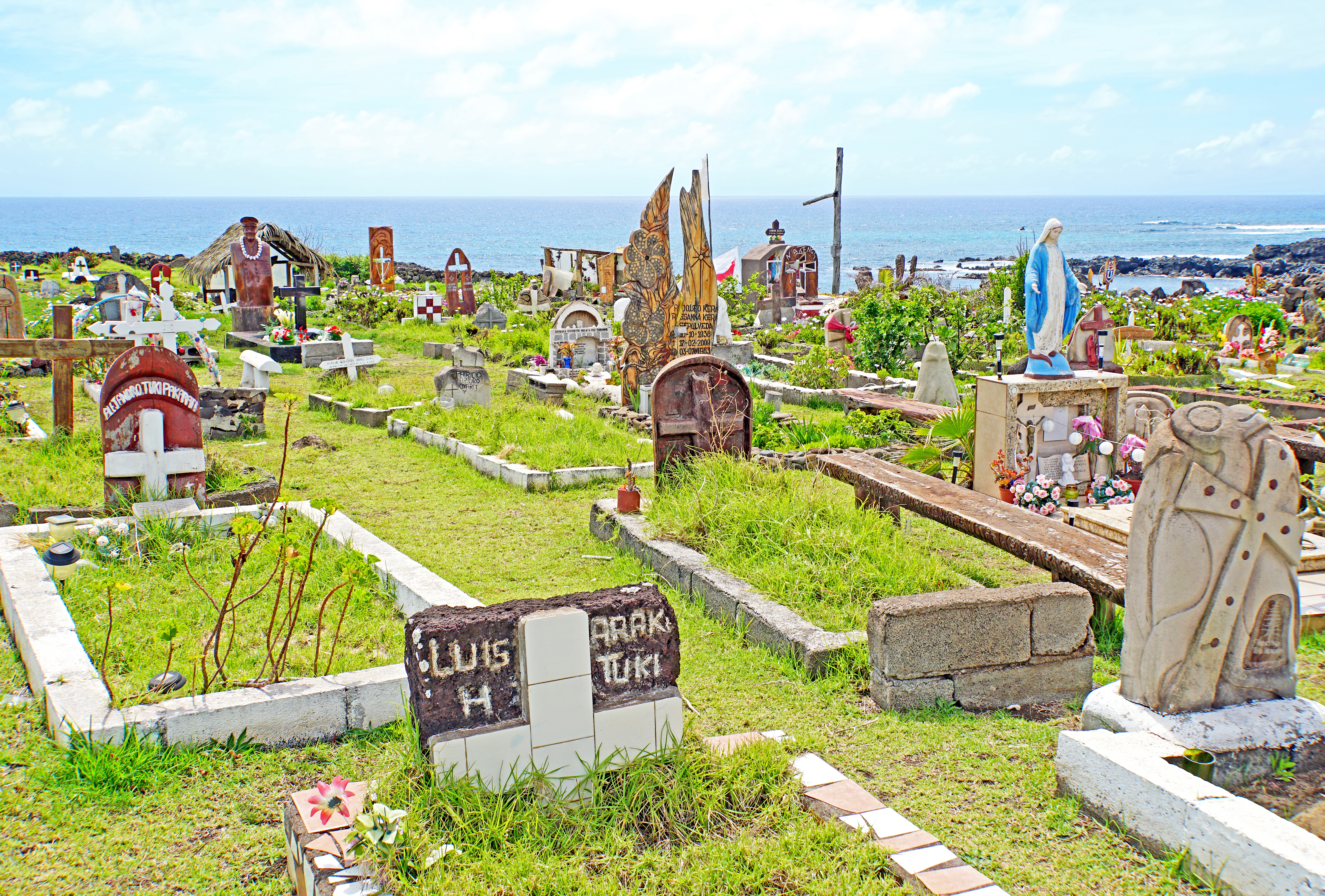 • The Easter Island cemetery is unique in many ways. Some of the tombstones are adorned with motifs that combine Christian and Rapa Nui iconography.