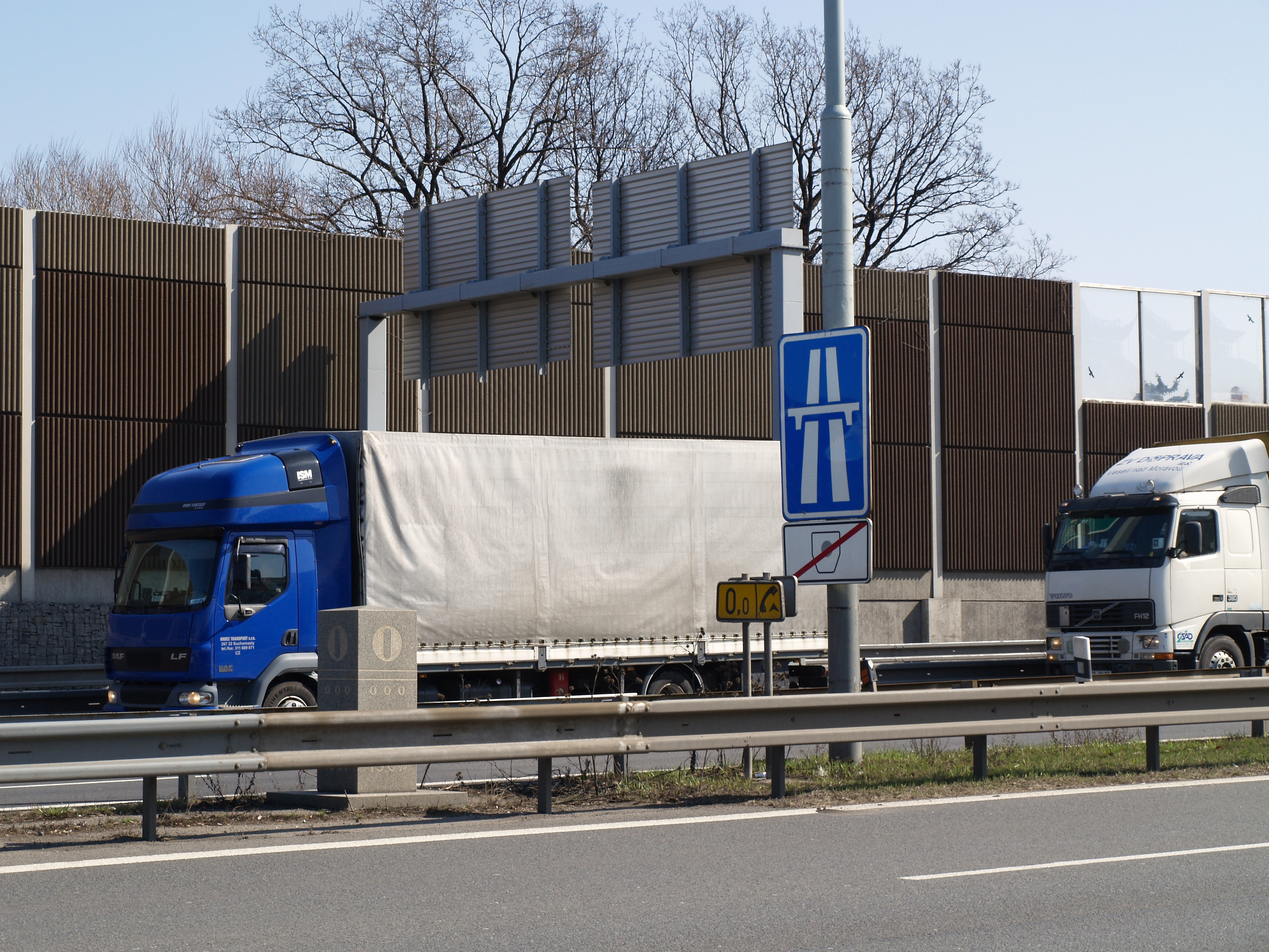 - Čeština: Trojí označení začátku dálnice D1 na Chodově: zleva „patník“ (1967), žlutý 0. kilometr a označení začátku dálnice (do exitu Chodov bez poplatku)