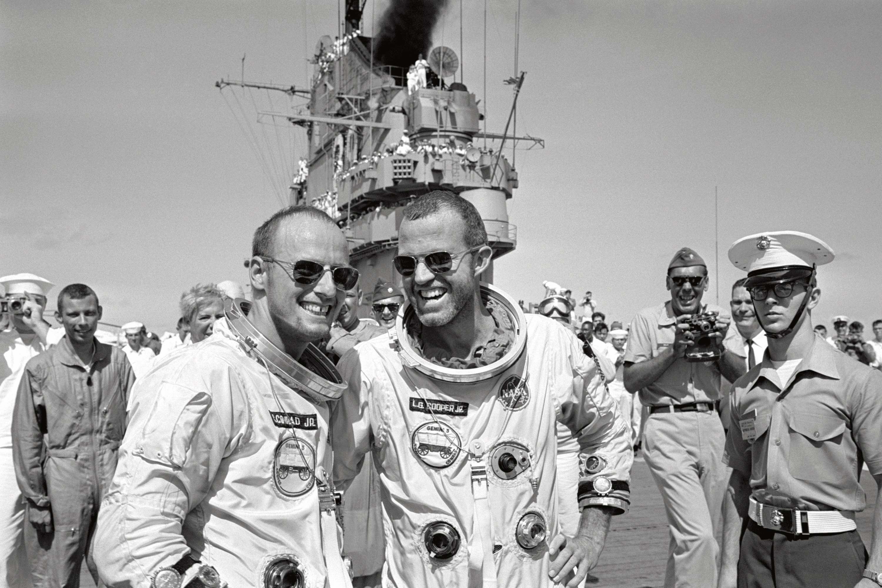 Fotografie + Description: English: The U.S. astronauts L. Gordon Cooper Jr. (right) and Charles Conrad Jr. walk across the deck of the recovery aircraft carrier USS Lake Champlain (CVS-39) following splashdown and recovery from the ocean, 29 August 1965.