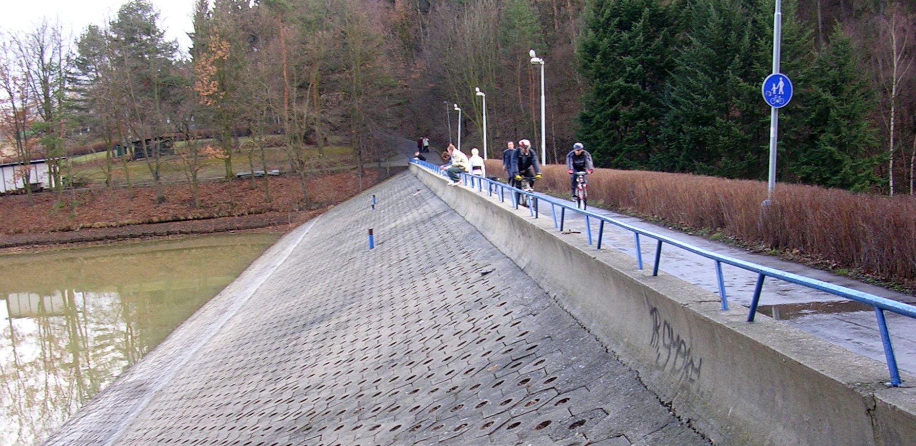 Fotografie + Čeština: Cyklostezka po hrázi přehrady na Botiči v Praze–Hostivaři.
