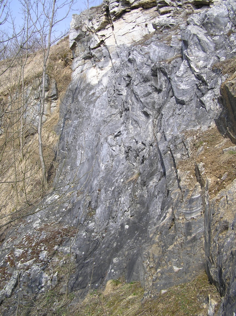- Čeština: Tmavé sinicové povlaky na vápencové skále. Lokalita: Dolní Nerestce (PI)