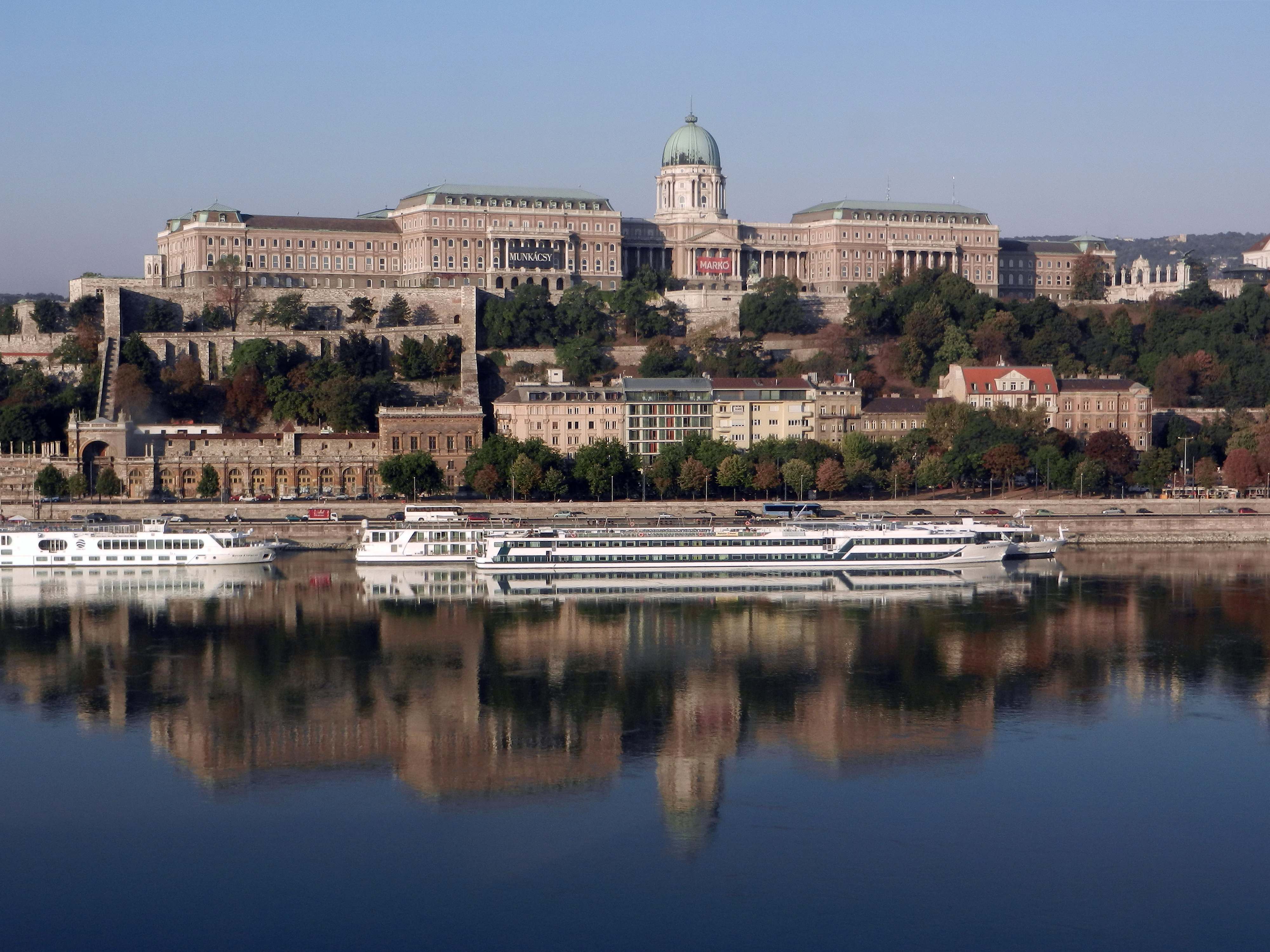 Fotografie + Deutsch: Kabinenfahrgastschiff Danubia unterhalb des Burgpalasts in Budapest