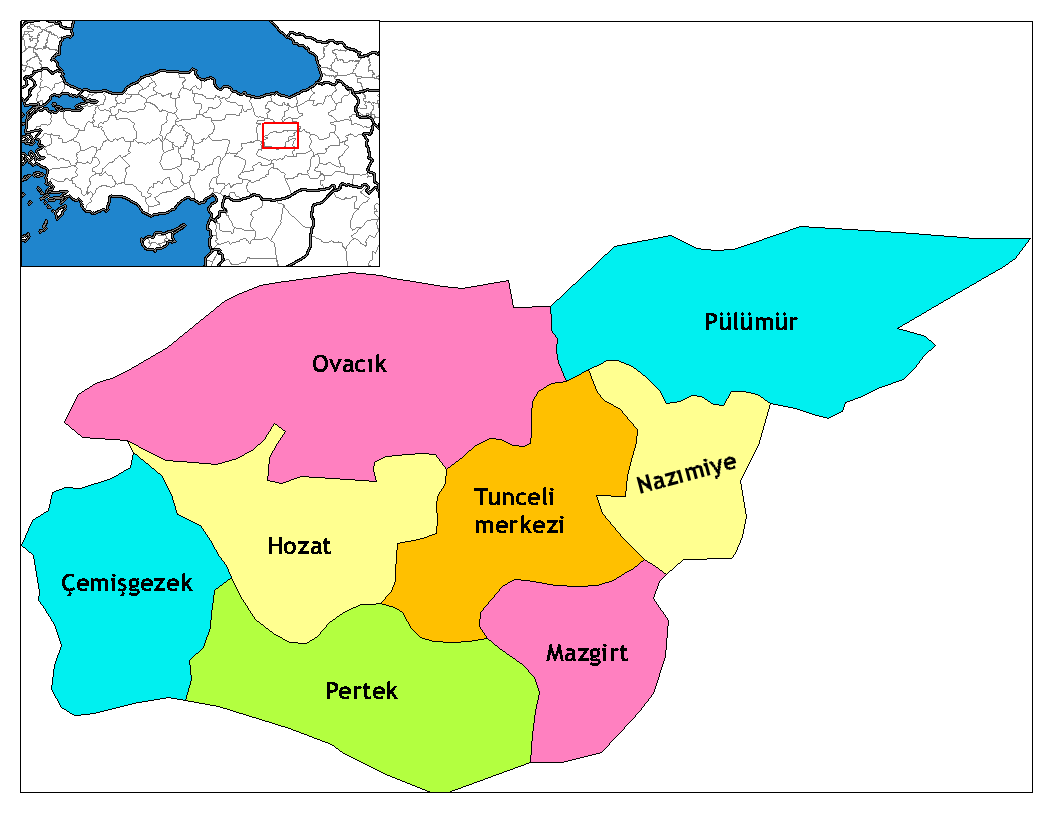 - Map of the districts of Tunceli province in Turkey. Created by Rarelibra 17:52, 4 December 2006 (UTC) for public domain use, using MapInfo Professional v8.5 and various mapping resources. Edited by One Homo Sapiens Corrected text where İ,Ş,ı,ğ,or ş occurs in name. Source: [statoids-com]. Increased font size and enhanced color differences among adjacent districts.