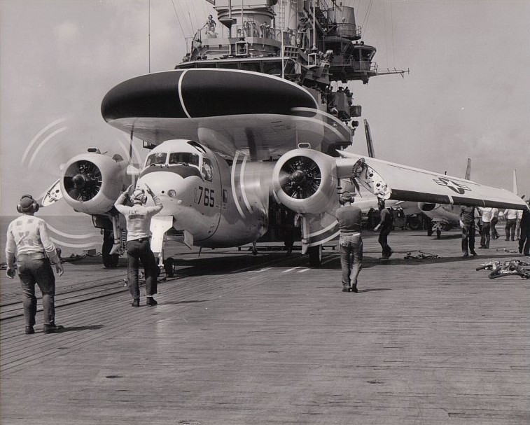 Fotografie + Description: A Grumman WF-2 Tracer of airborne early warning squadron VAW-11 Early Eleven, Carrier Air Group Twenty-One (CVG-21), unfolding its wings prior to launching from the aircraft carrier USS Hancock (CVA-19) on 23 August 1962. A month later the WF-2 would be redesignated E-1B.