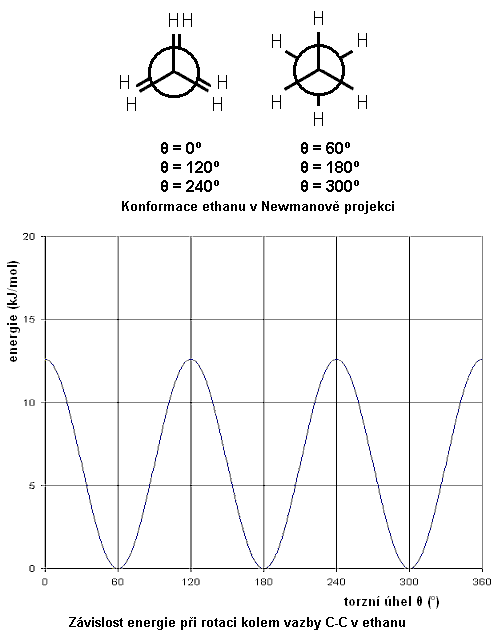 Obrázek + Čeština: Konformace ethanu. V horní části jsou zobrazeny konformace v Newmanově projekci, v dolní je graf závislosti potenciální energie na trozním úhlu.