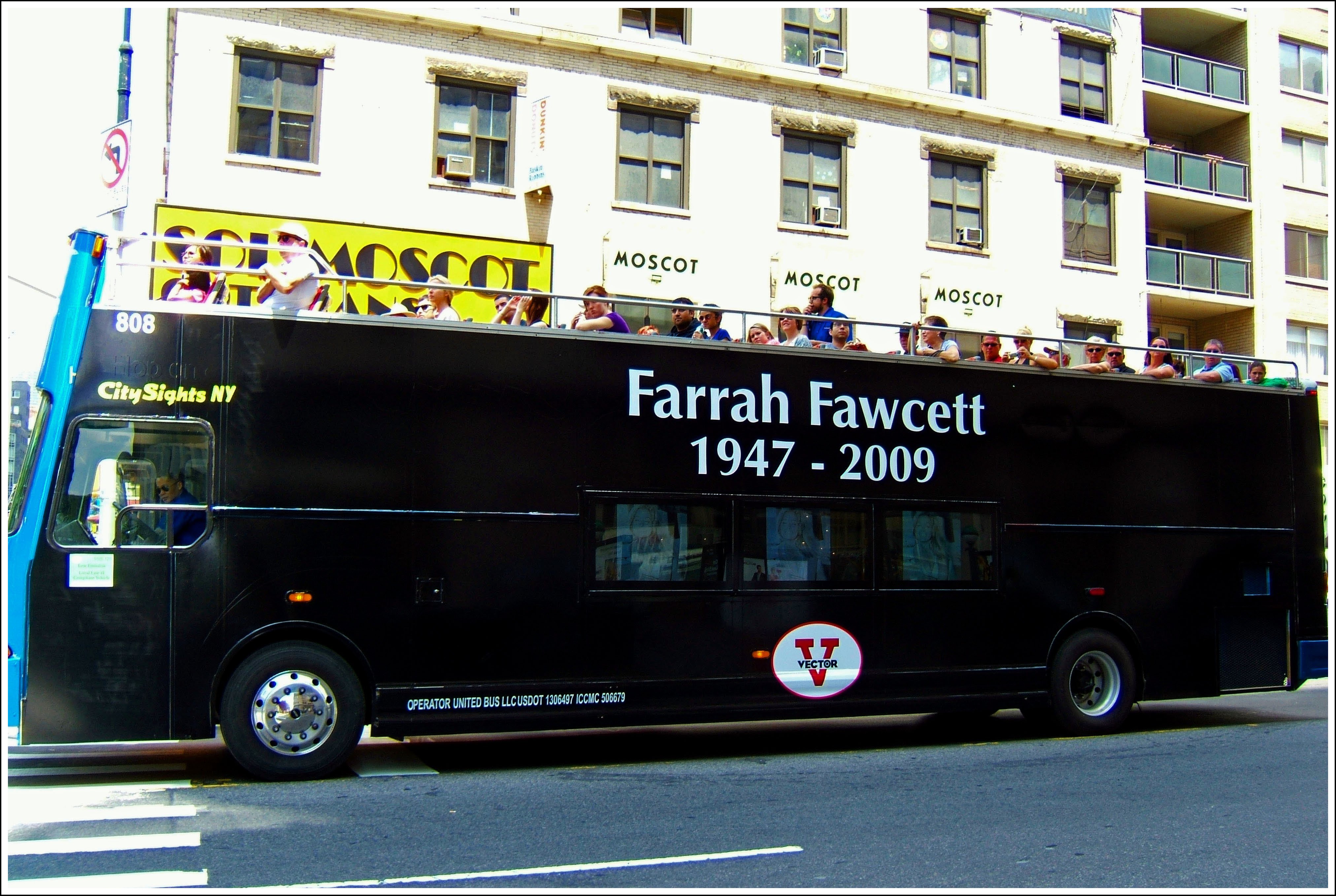 Fotografie + Description: Farrah Fawcett. I saw this New York City tour bus on June 29, 2009, four days after her death.