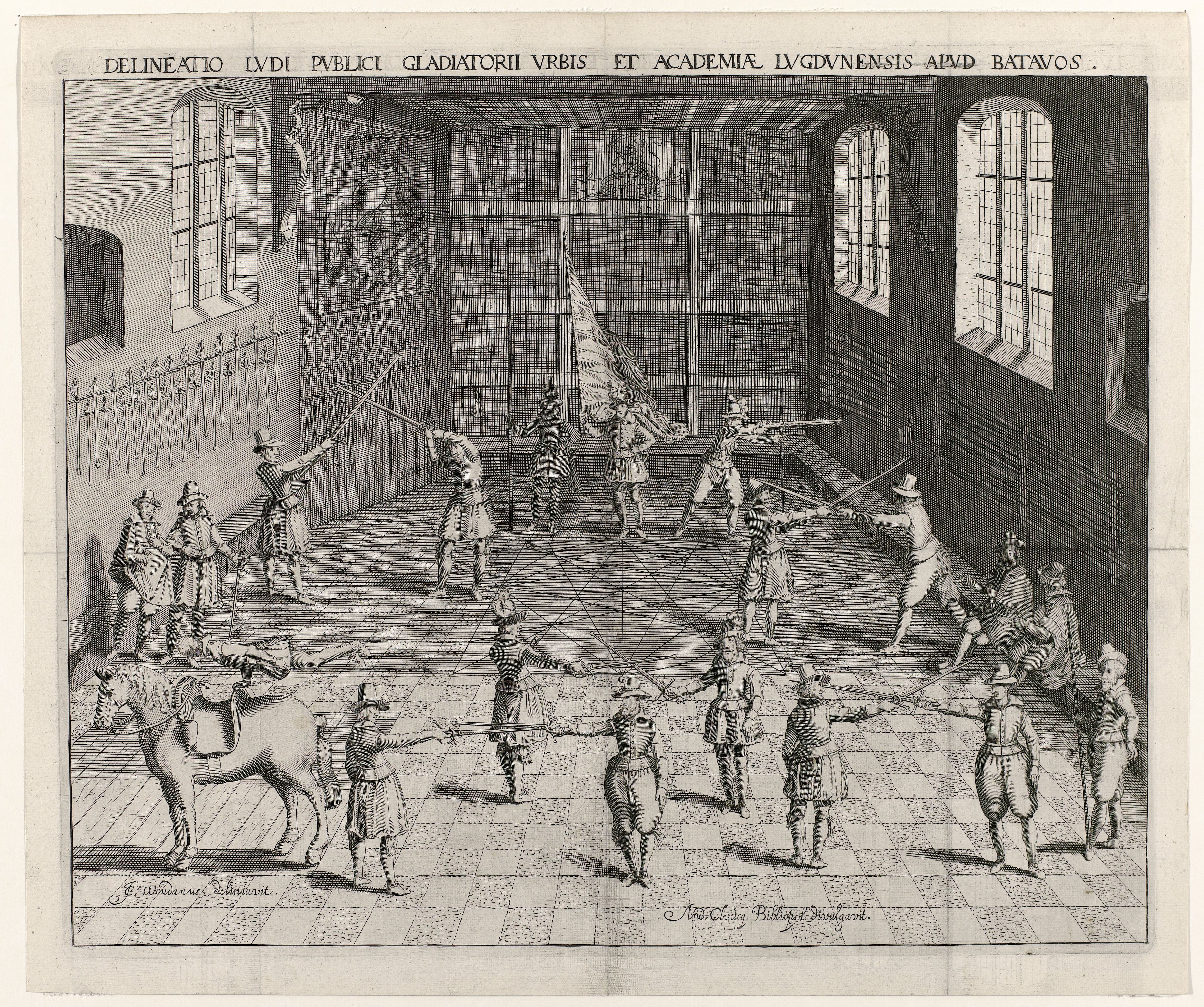- Nederlands: Schermschool van de Universiteit van Leiden. Delineatio ludi publici gladiatorii urbis et academiae Lugdunensis apud Batavos (titel op object). Vier gezichten van de Universiteit van Leiden (serietitel). ObjectnummerRP-P-1893-A-18091. Lugt 2228.