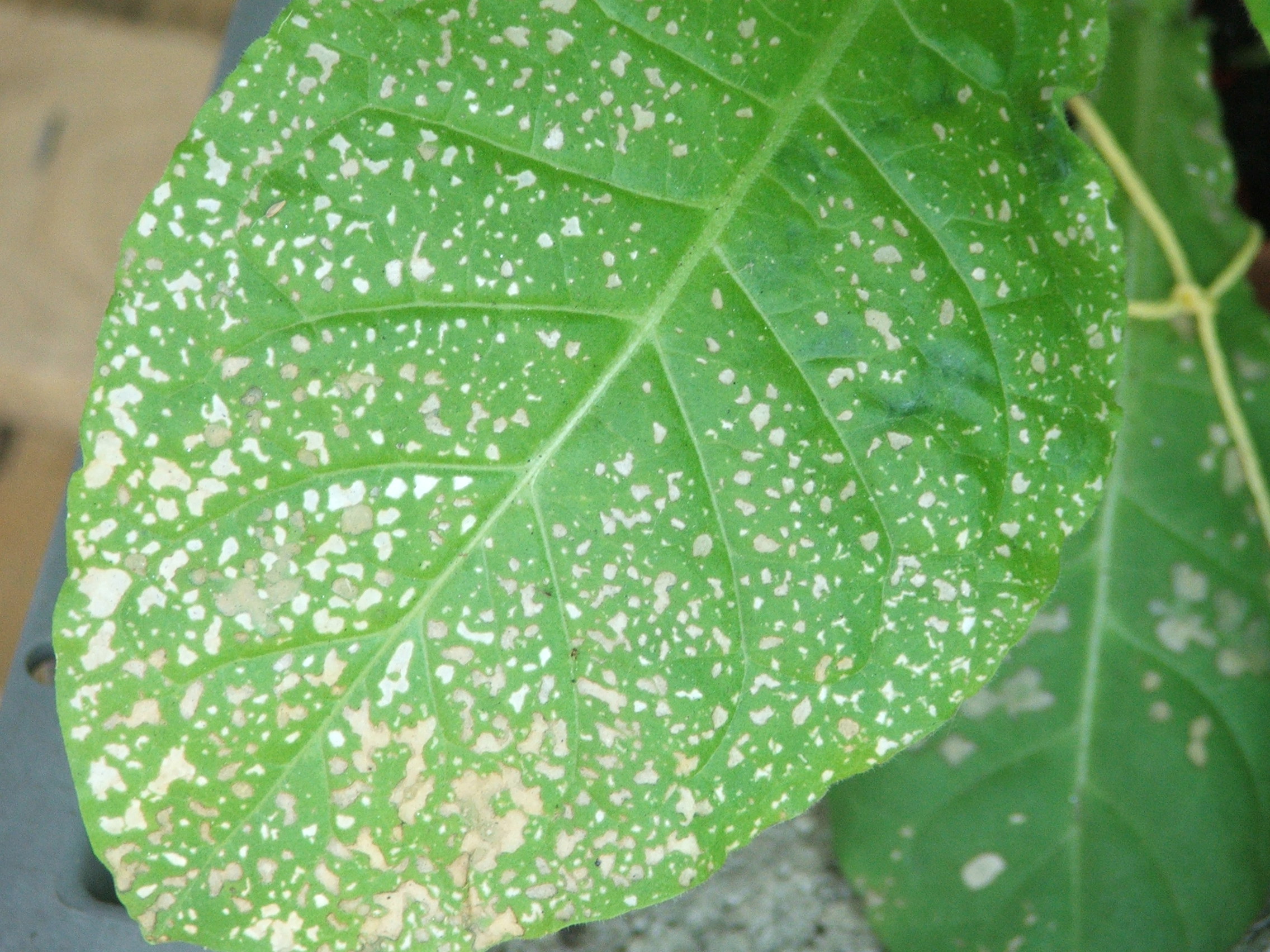 - Français : Feuille de tabac nécrosée en raison de la pollution à l'ozone (bioindication)