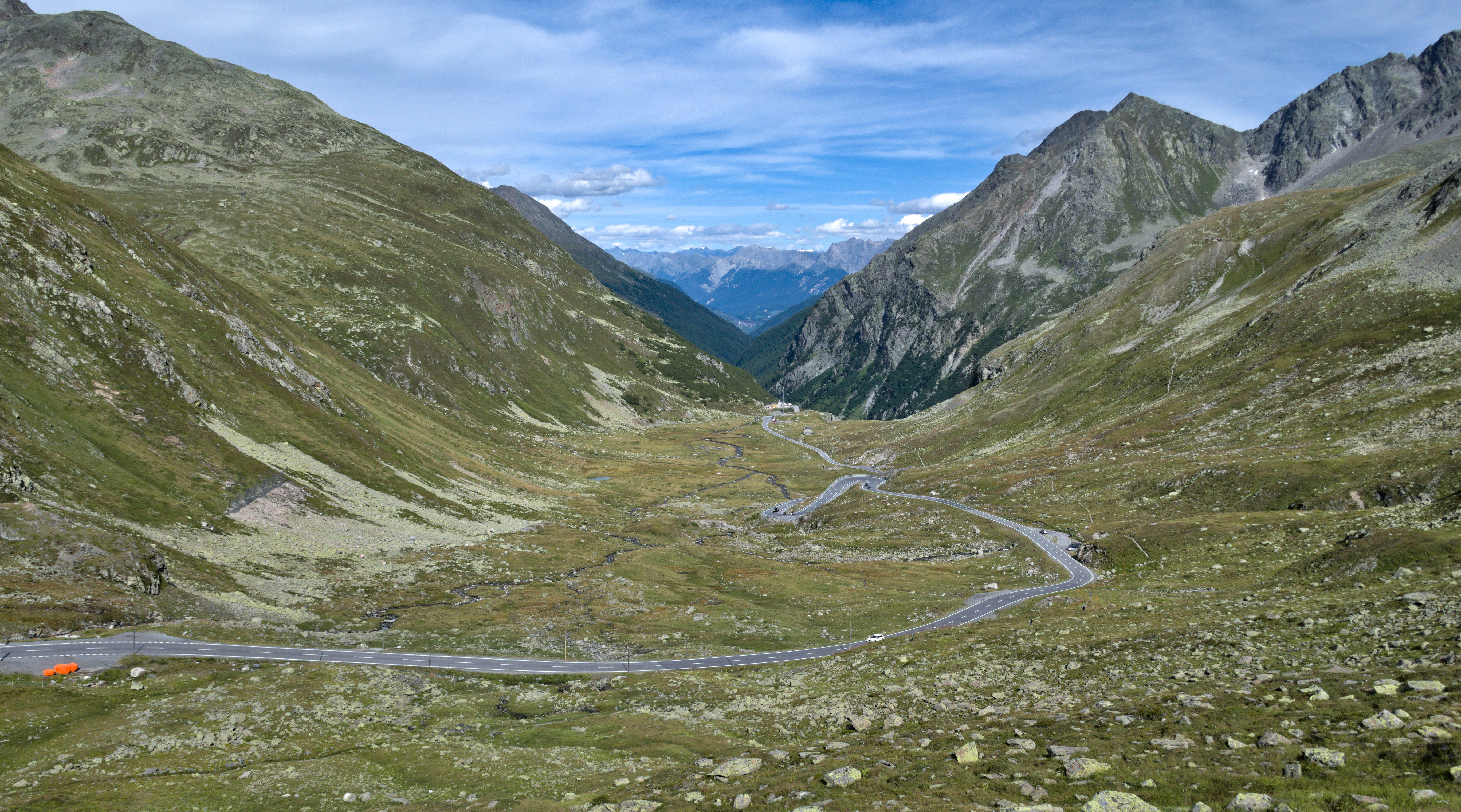 - English: Flüelapass road in Susch, Switzerland. View towards east.