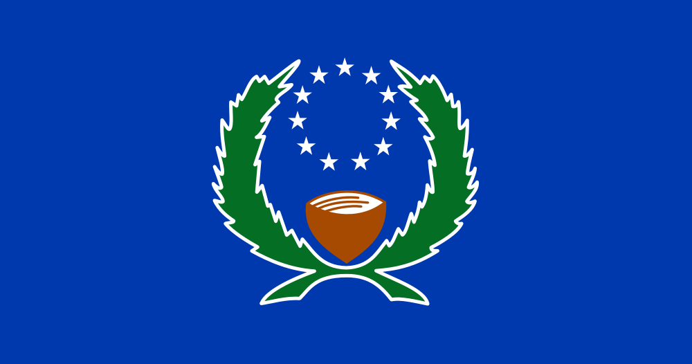 - Description of the flag: „Pohnpei state flag has a number of images, each symbolizing a significant part of Pohnpei’s cultural lifestyle. The blue background represents the ever-present ocean. The sakau cup (made of an half coconut shell) represent the symbolic uniqueness of Pohnpeian culture. The eleven stars signify each of the municipalities in Pohnpei. The coconut leaves symbolize the importance of the plant for the state.