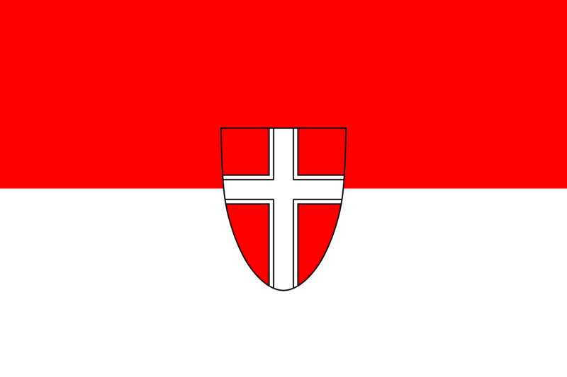 Oficiální vlajka rakouského města + Vídně (State service flag of the state of Vienna) + pochází z Wikimedia Commons, kde má status – This image is in the public domain according to Austrian copyright law because it is part of a law, ordinance or official decree issued by an Austrian federal or state authority, or because it is of predominantly official use.