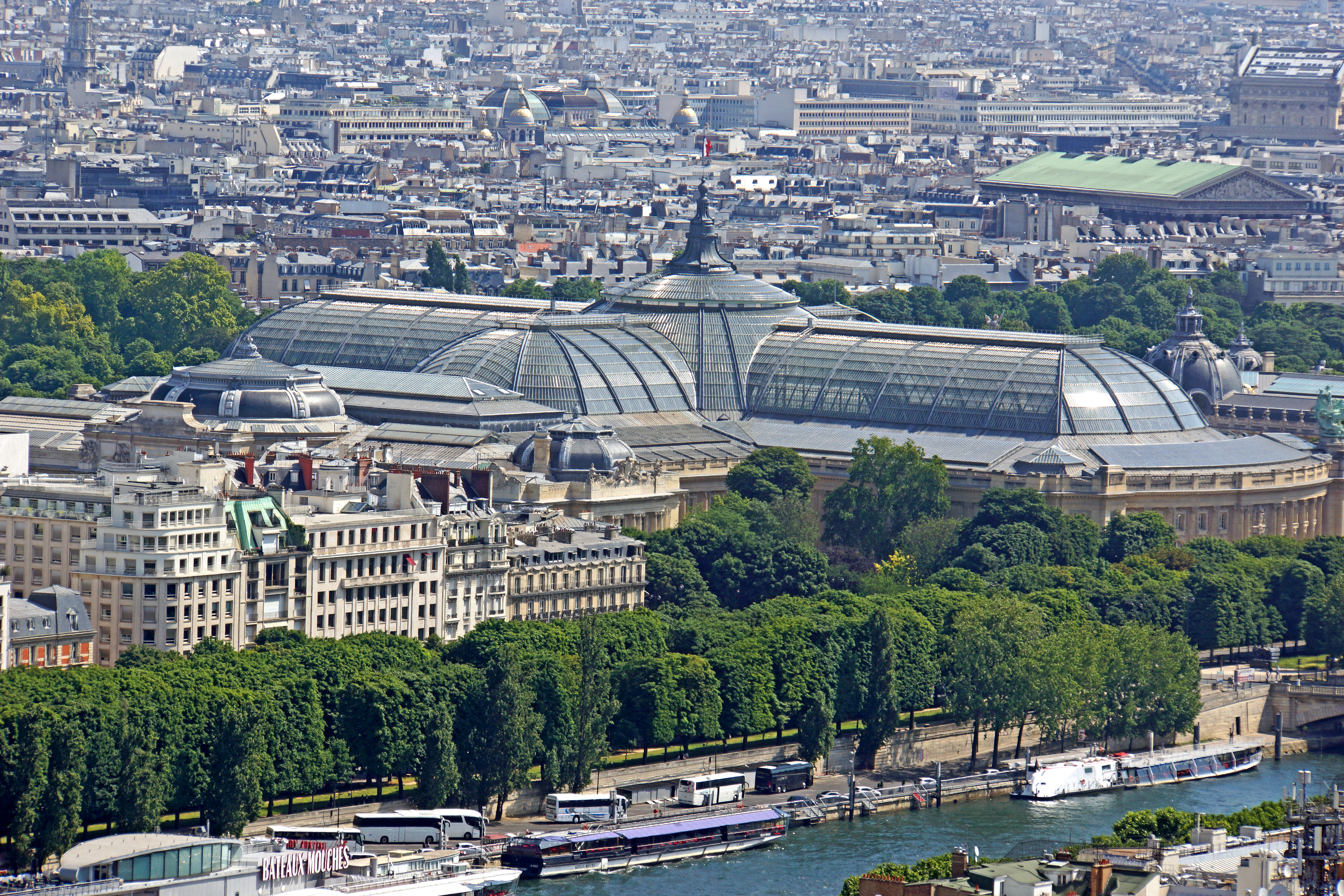 - View from the second level of the Eiffel Tower. Large glassed building is, Paris' Grand Palais (Big Palace)