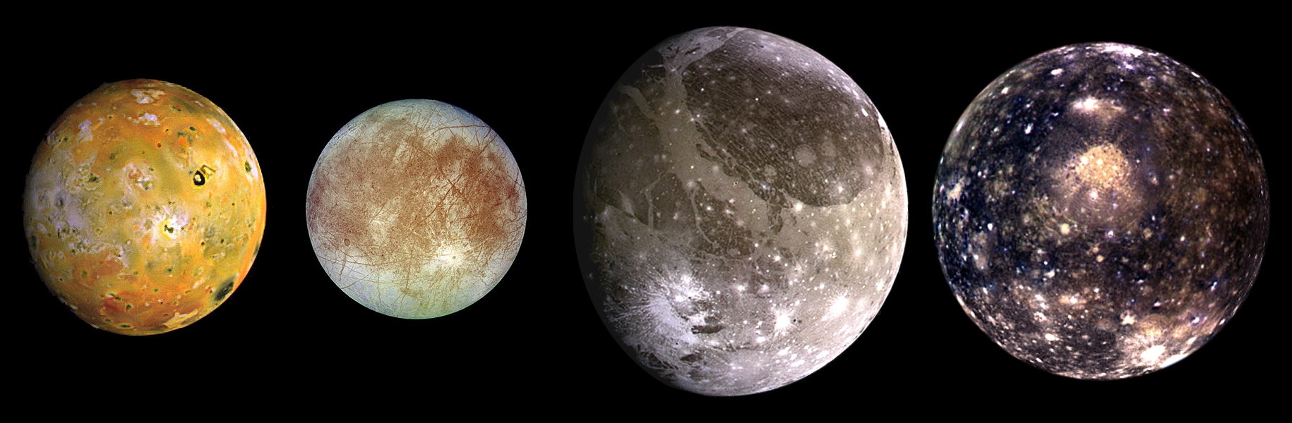 This composite includes the four largest moons of Jupiter which are known as the Galilean satellites. The Galilean satellites were first seen by the Italian astronomer Galileo Galilei in 1610. Shown from left to right in order of increasing distance from Jupiter, Io is closest, followed by Europa, Ganymede, and Callisto. The order of these satellites from the planet Jupiter helps to explain some of the visible differences among the moons. Io is subject to the strongest tidal stresses from the massive planet. These stresses generate internal heating which is released at the surface and makes Io the most volcanically active body in our solar system. Europa appears to be strongly differentiated with a rock/iron core, an ice layer at its surface, and the potential for local or global zones of water between these layers. Tectonic resurfacing brightens terrain on the less active and partially differentiated moon Ganymede. Callisto, furthest from Jupiter, appears heavily cratered at low resolutions and shows no evidence of internal activity. North is to the top of this composite picture in which these satellites have all been scaled to a common factor of 10 kilometers (6 miles) per picture element. The Solid State Imaging (CCD) system aboard NASA's Galileo spacecraft acquired the Io and Ganymede images in June 1996, the Europa images in September 1996, and the Callisto images in November 1997. Launched in October 1989, the spacecraft's mission is to conduct detailed studies of the giant planet, its largest moons and the Jovian magnetic environment. The Jet Propulsion Laboratory, Pasadena, CA, manages the mission for NASA's Office of Space Science, Washington, DC.