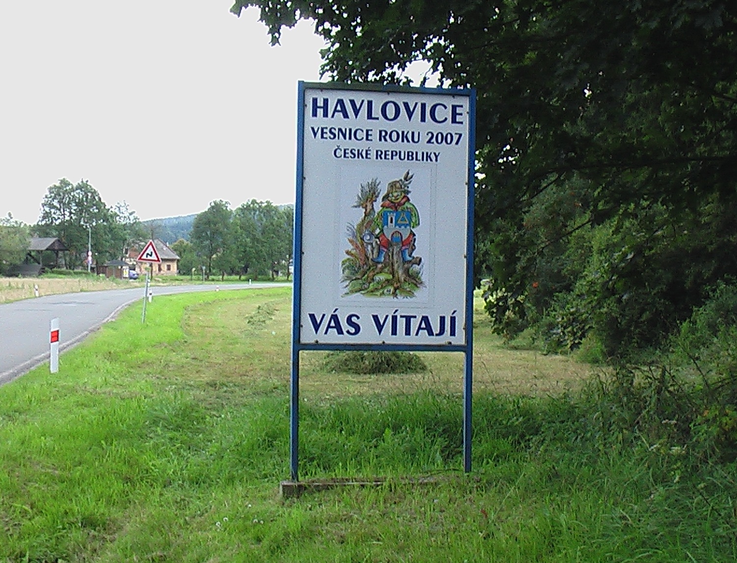 - Čeština: Tabule ukazující na vítězství Havlovic v anketě Vesnice roku