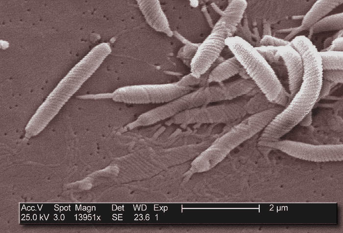- English: This scanning electron micrograph depicts a grouping of Gram-negative ”Flexispira rappini” bacteria, magnified 13,951x. Its name ”F. rappini” is considered provisional, for it was never formally proposed or accepted. Subsequently determined to be closely related to Helicobacter spp., it is referred to as Helicobacter sp. flexispira in the literature.