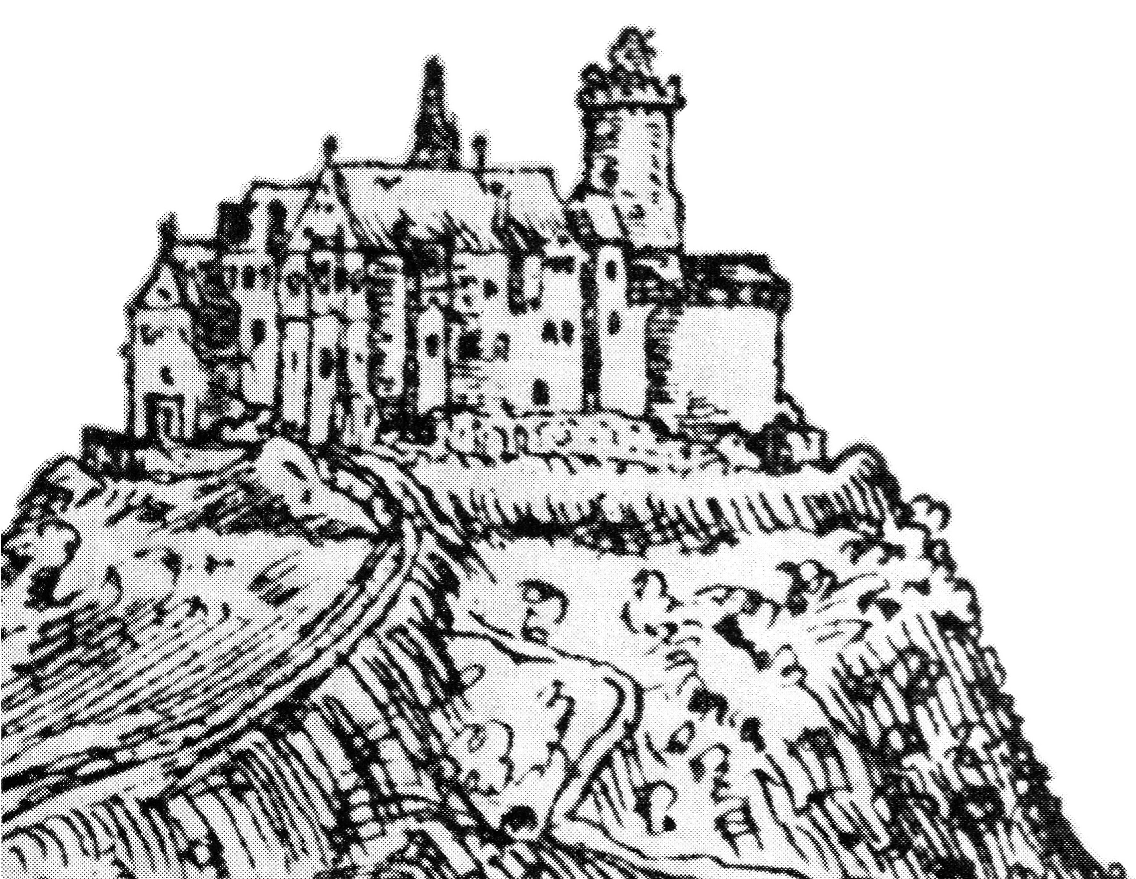 Fotografie + Čeština: Pohled na hrad Hněvín v Mostě na rytině z roku 1602 (detail).