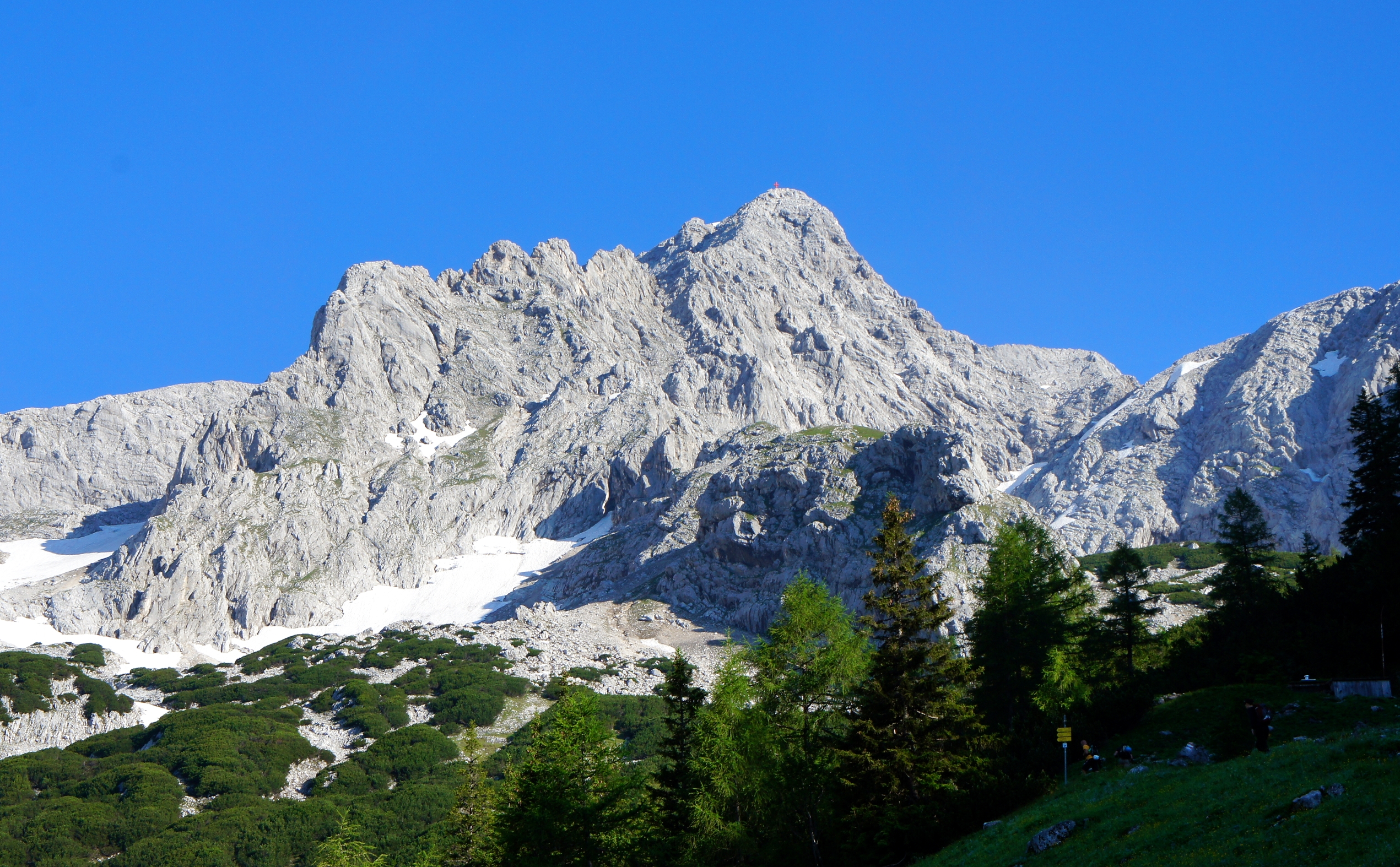 - English: View to the Grosser Priel mountain from the Prielschutzhaus mountain chalet (Upper Austria, Austria).
