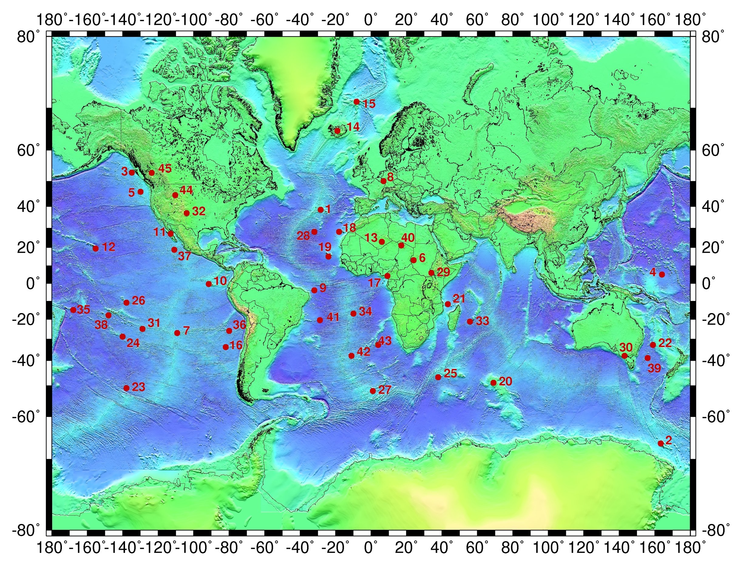 - Source: own work (created with GMT using (#1-44) the results published in: B. Steinberger, 2000, Plumes in a convecting mantle: Models and observations for individual hotspots, Journal of Geophysical Research, Vol 105 (B5), pp. 11127-11152): Wiley Online Library; Anahim hotspot (#45): Smithonian Institute (eng.)