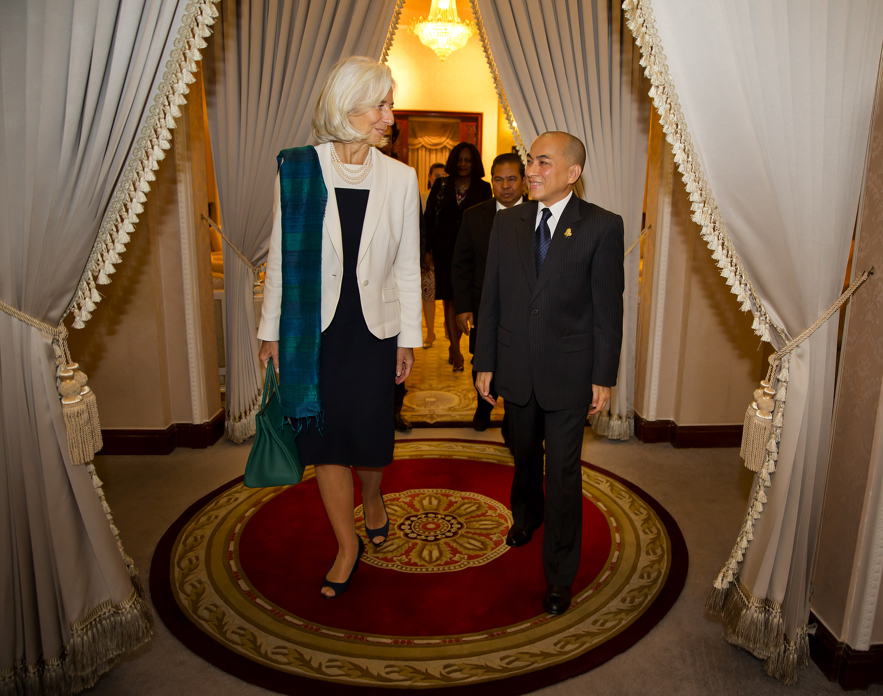 - International Monetary Fund Managing Director Christine Lagarde (L) talks with King Norodom Sihamoni (R) at the Royal Palace December 3, 2013 in Phom Penh, Cambodia. Lagarde is on a three country visit to Asia.
