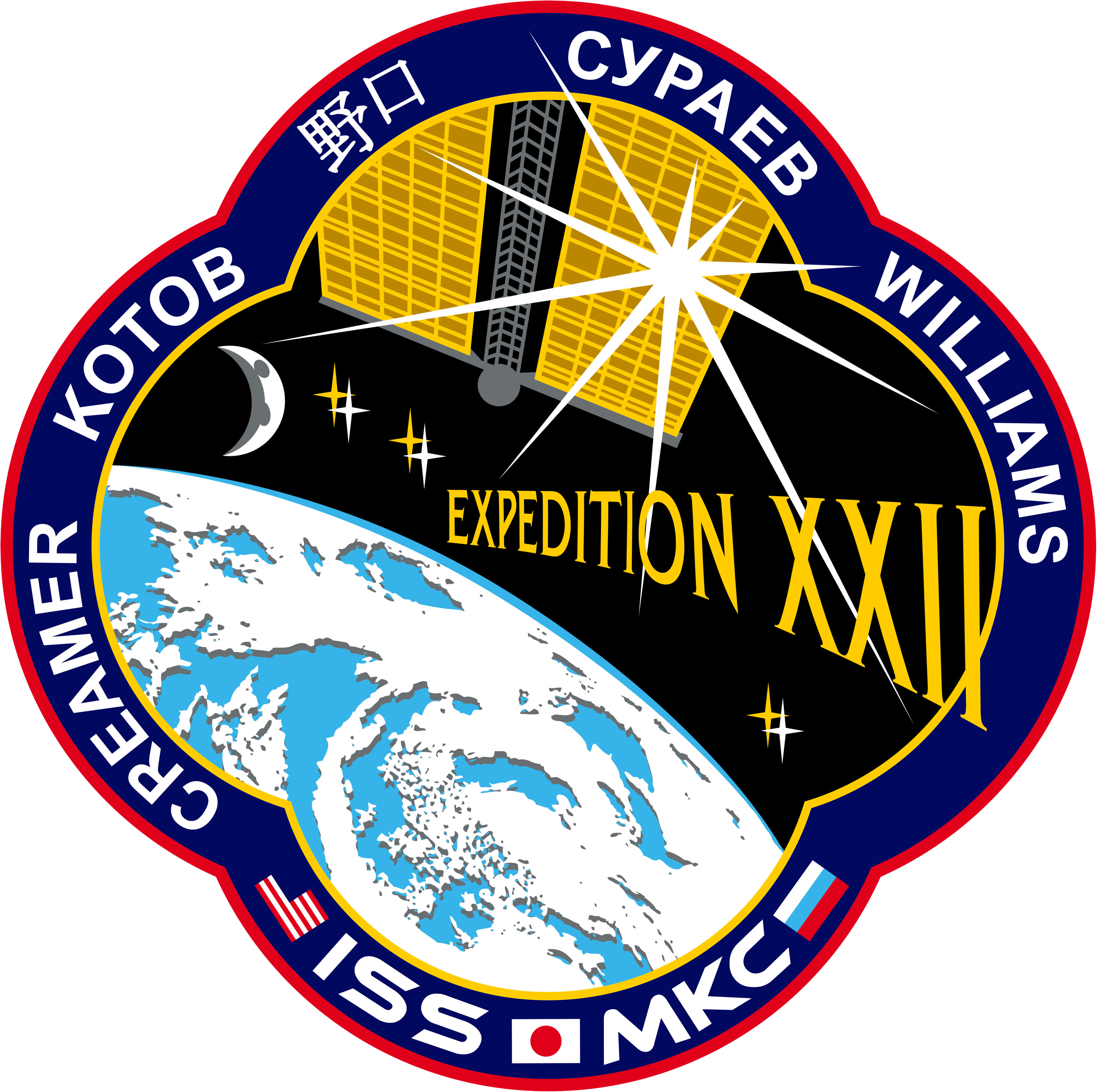 Obrázek + The 22nd Expedition to the International Space Station is dedicated to the final stages of assembly and the transition to full utilization as an orbiting laboratory. The sun, providing power and life support to the space station, shines through one of the solar arrays as the ISS orbits above Earth. The oceans and atmosphere, providing life support to Earth, are shown in all their beauty. The moon hovers in the distance as the goal of the next era of exploration. The six stars illustrate the increased capability of the crew complement. In the border are the national flags of the crew members as well as their surnames in their native languages. Expedition XXII continues the effort to acquire the knowledge necessary to extend the reach of exploration from Earth, to the moon and beyond. (únor 2009)