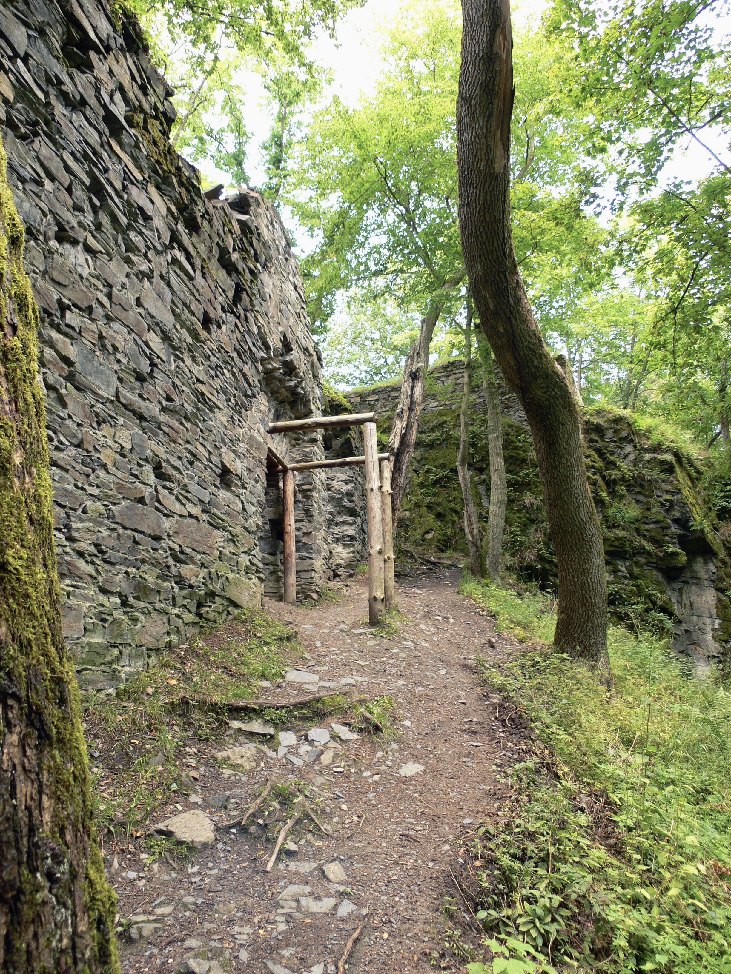 Fotografie + Čeština: Vstup do hradu a zbytky zdiva věže při pohledu od jihu.