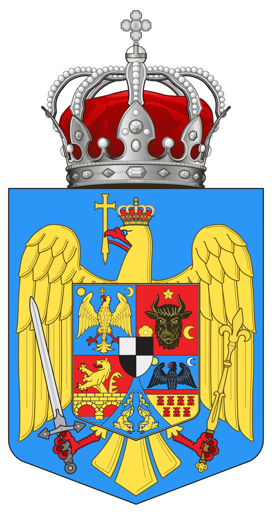 Oficiální znak + Description: Small Coat of arms of Kingdom of Romania (between June 23, 1921 and December 30, 1947)