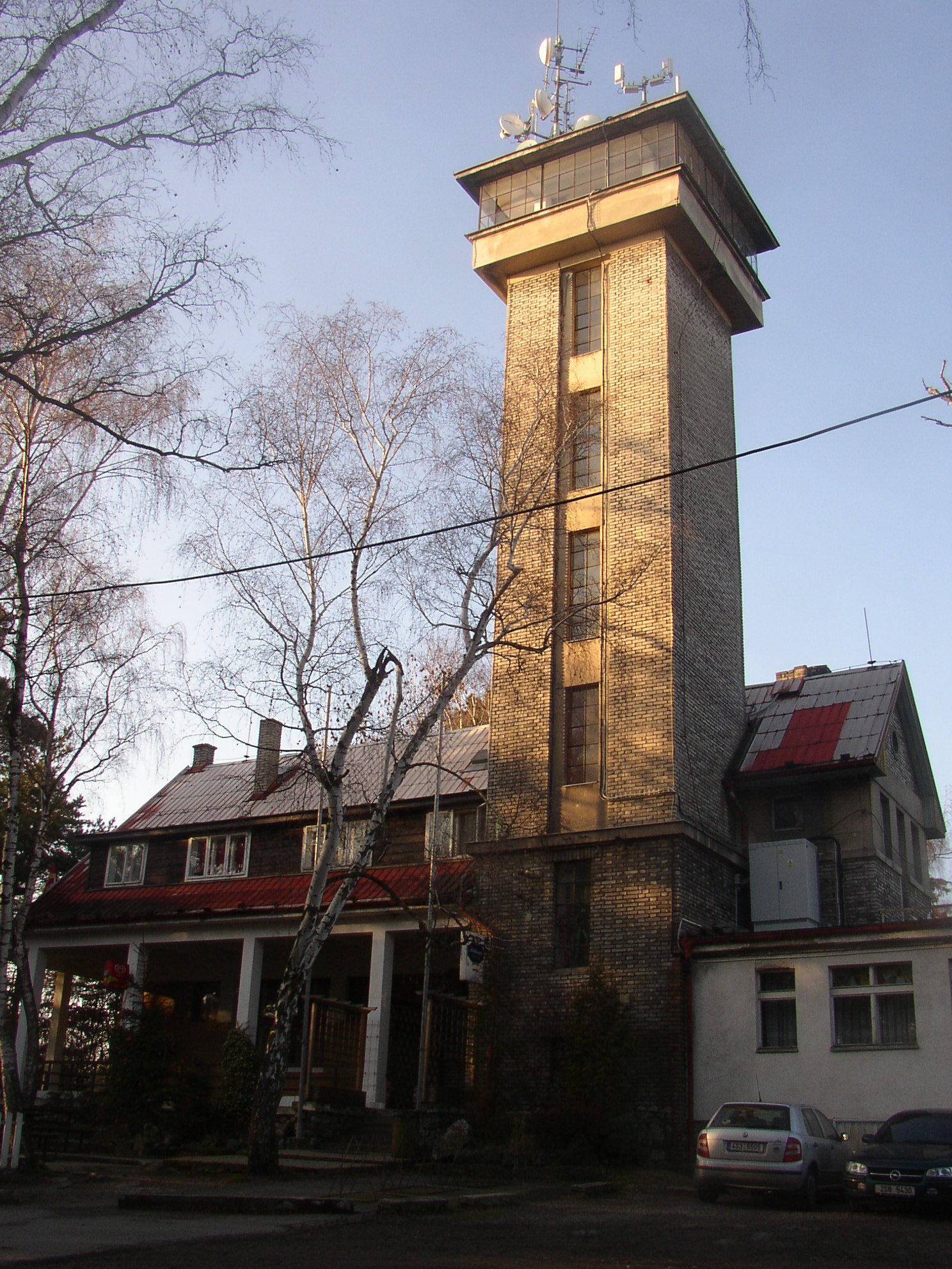 - English: Restaurant and lookout tower at Kožova hora near Kladno, Czech Republic.