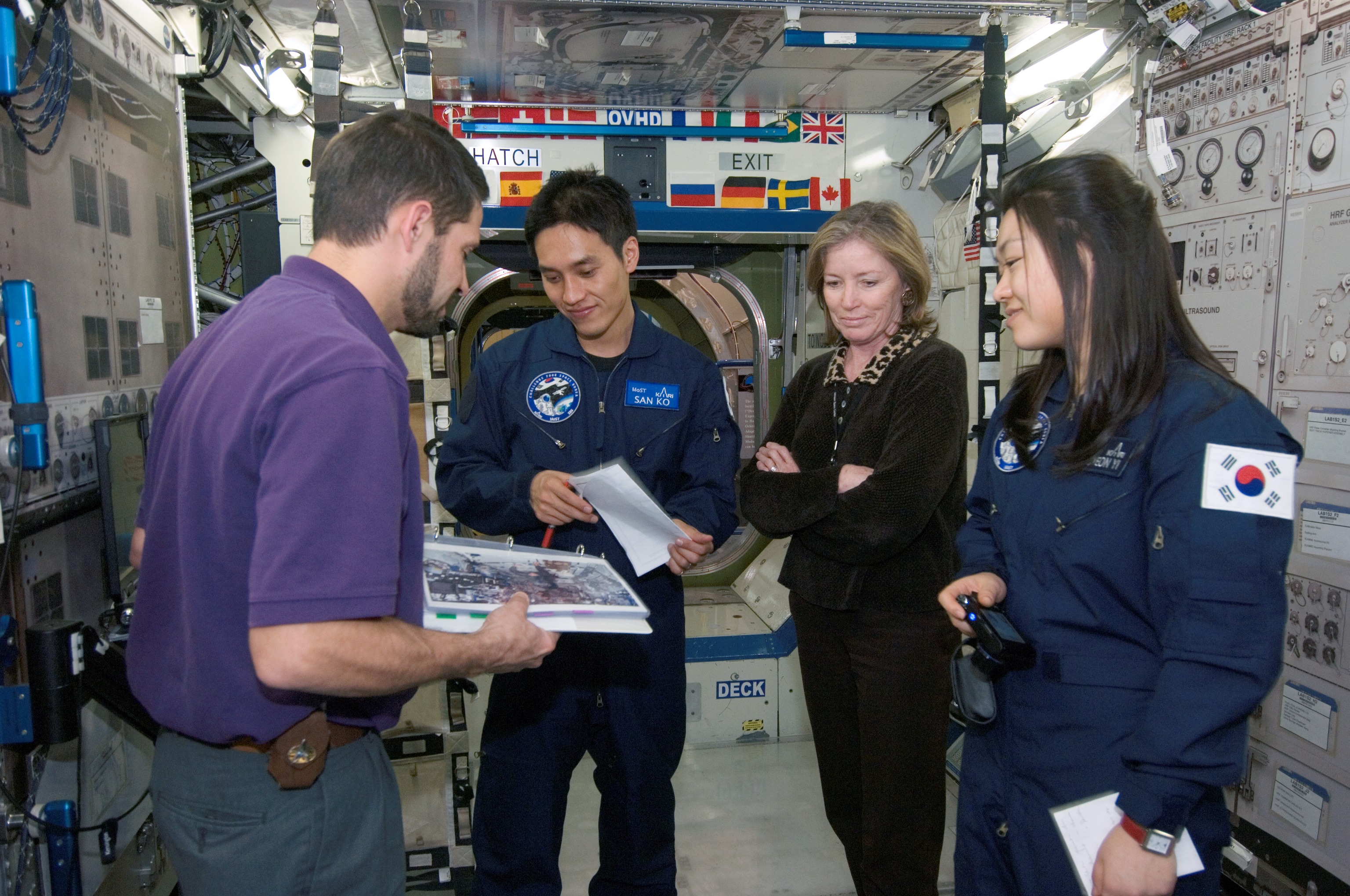 - English: San Ko (second left) and So-yeon Yi (right), South Korean prime and backup spaceflight participants, respectively, participate in a space station hardware training session in the Space Vehicle Mockup Facility at the Johnson Space Center. San is scheduled to launch with the Expedition 17 crew on the Soyuz TMA-12 spacecraft April 8 from the Baikonur Cosmodrome under a commercial agreement between the South Korean government and Roscosmos for nine days on the International Space Station.However, Yi Soyeon replaces his position now.