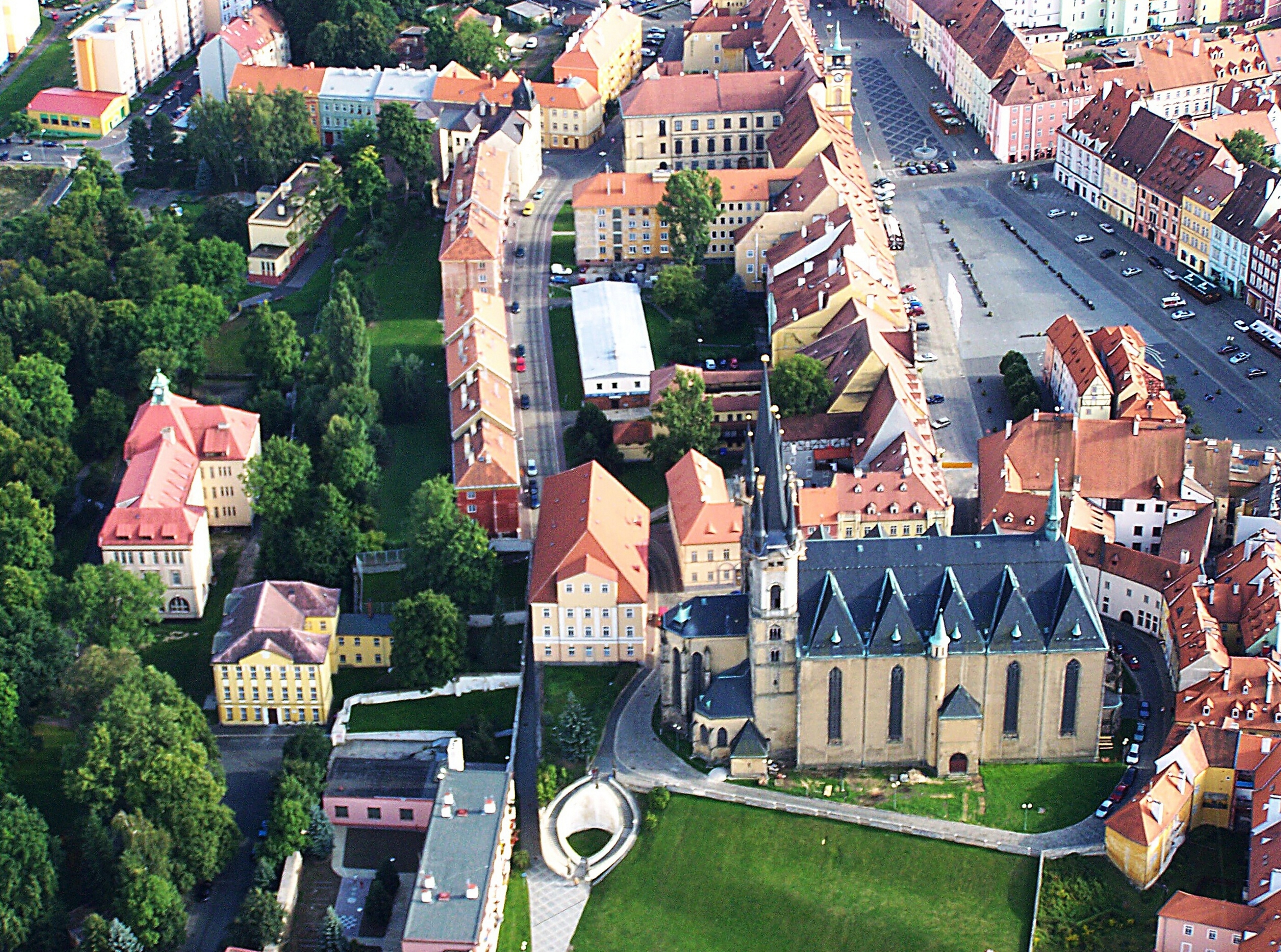 Oficiální fotografie + Česky: Kostel svatého Mikuláše, Cheb (aerial photo)