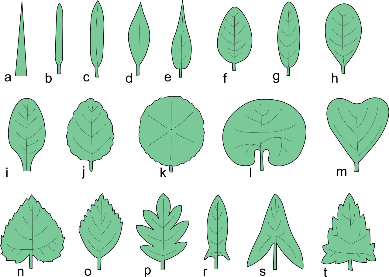 - Polski: Kształty liści (liście pojedyncze); a. szpilkowy, b. igłowy, c. równowąski, d. lancetowaty, e. owalnie lancetowaty, f. jajowaty, g. spiczasto-jajowaty, h. odwrotnie jajowaty, i. łopatkowaty, j. eliptyczny, k. okrągły, l. nerkowaty, m. odwrotnie sercowaty, n. sercowaty, o. romboidalny, p. pierzastowrębny, r. oszczepowaty, s. strzałkowaty, t. trójkątny