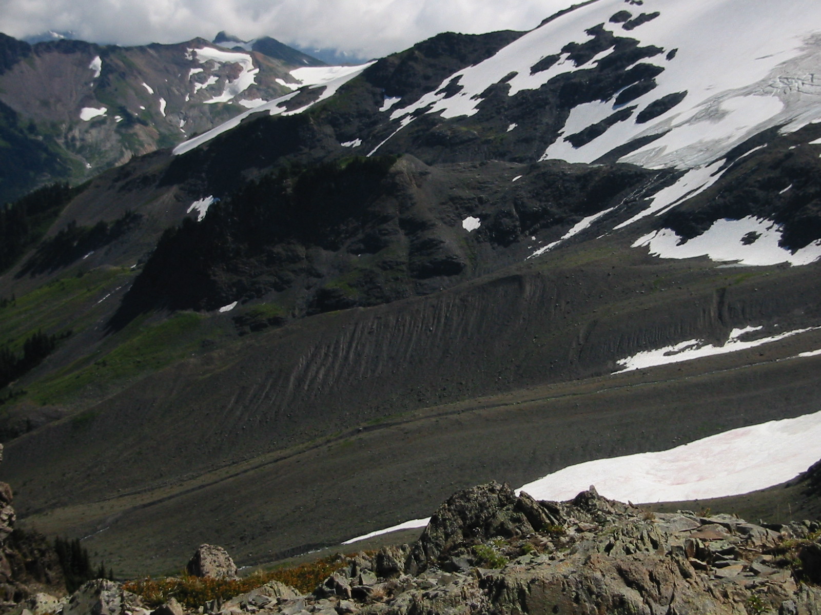 • English: Moraine below Hadley Glacier (visible in the upper left corner). This large moraine indicates that the Hadley Glacier once extended hundreds of feet below its 2003 terminus at about 6200 feet.