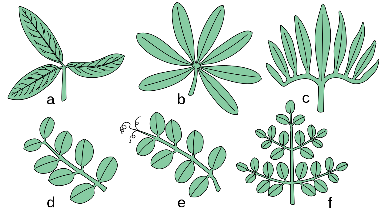 - Legenda: a. liść trójlistkowy, b. dłoniasto złożony, c. wachlarzowatopalczasty, d. parzystopierzasty, e. nieparzystopierzasty z wąsami, f. podwójnie nieparzystopierzasty
