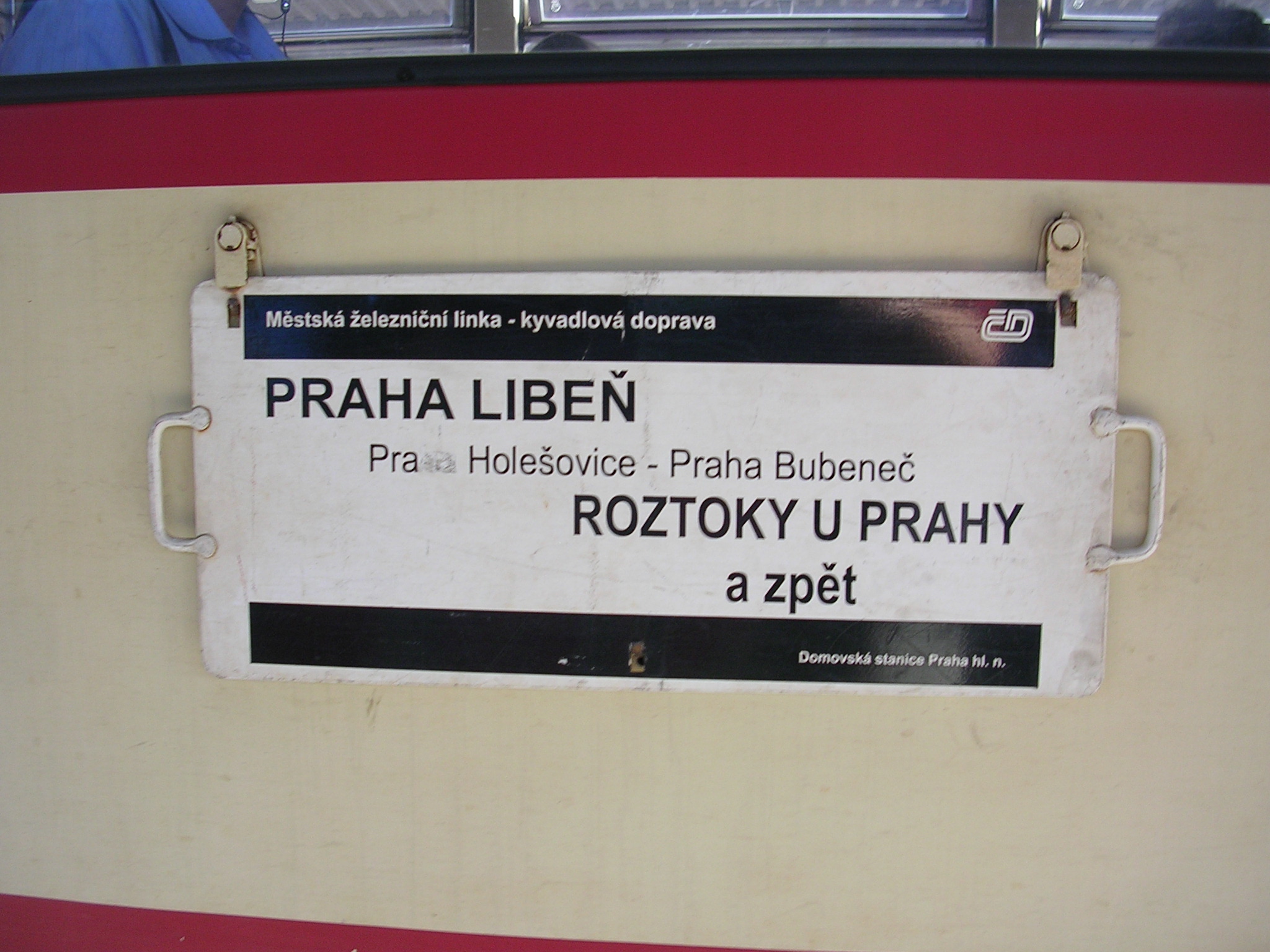 Fotografie + Čeština: Tabule na boku vozu městské železniční linky ML (Praha-Libeň - Roztoky u Prahy) v Praze.