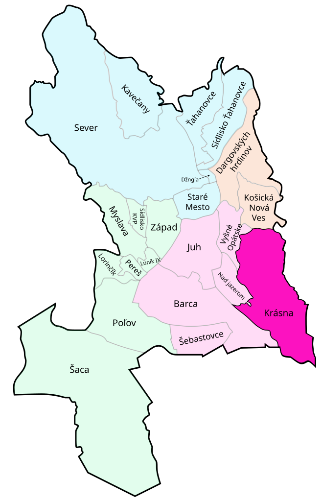 - English: Map of Krásna borough, location within Košice, Slovakia