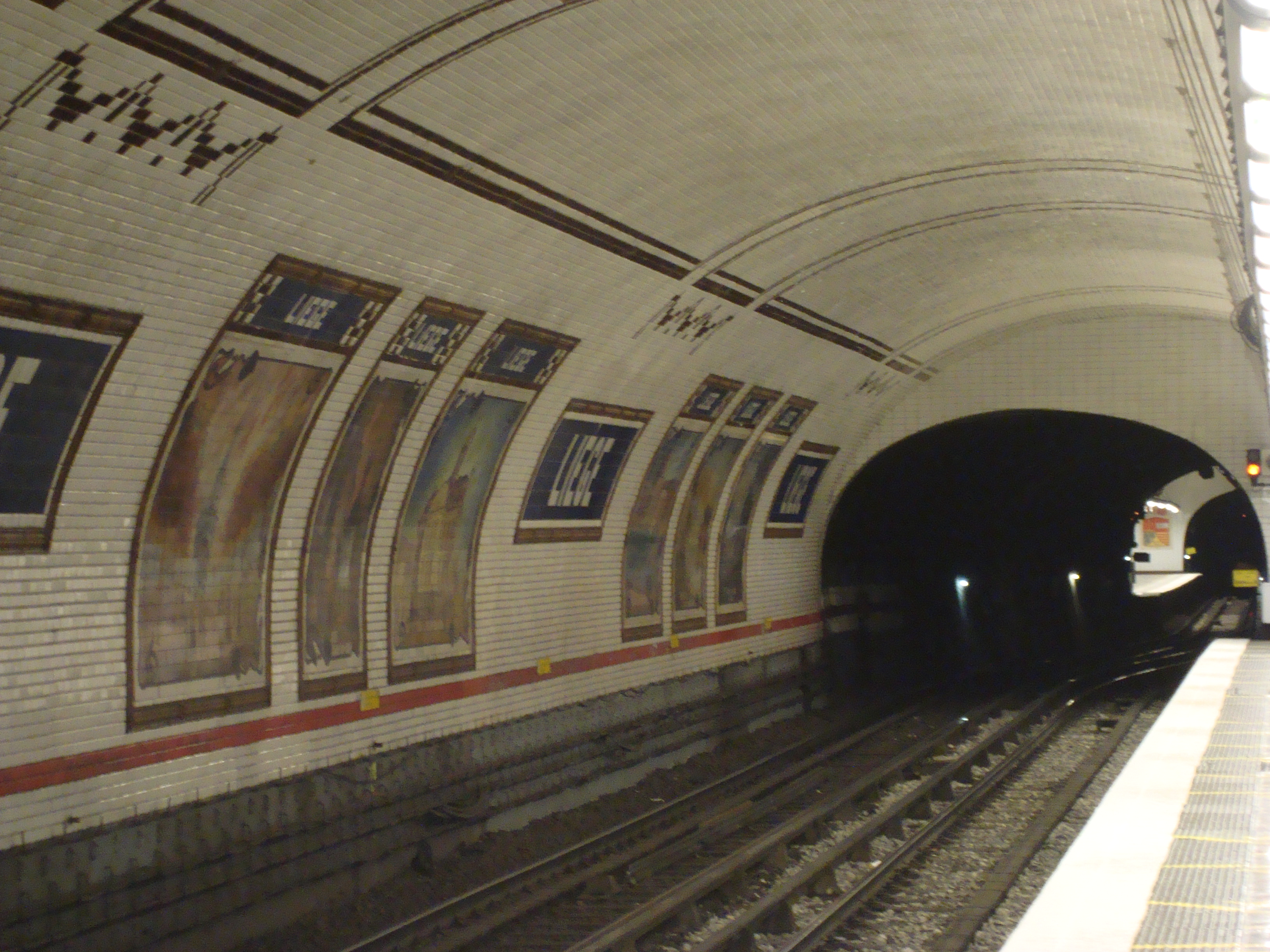 Fotografie + Français : Vue (au fond) du quai direction Sud-Nord depuis le quai Nord-Sud à la station de métro à quais décalés Liège à Paris.