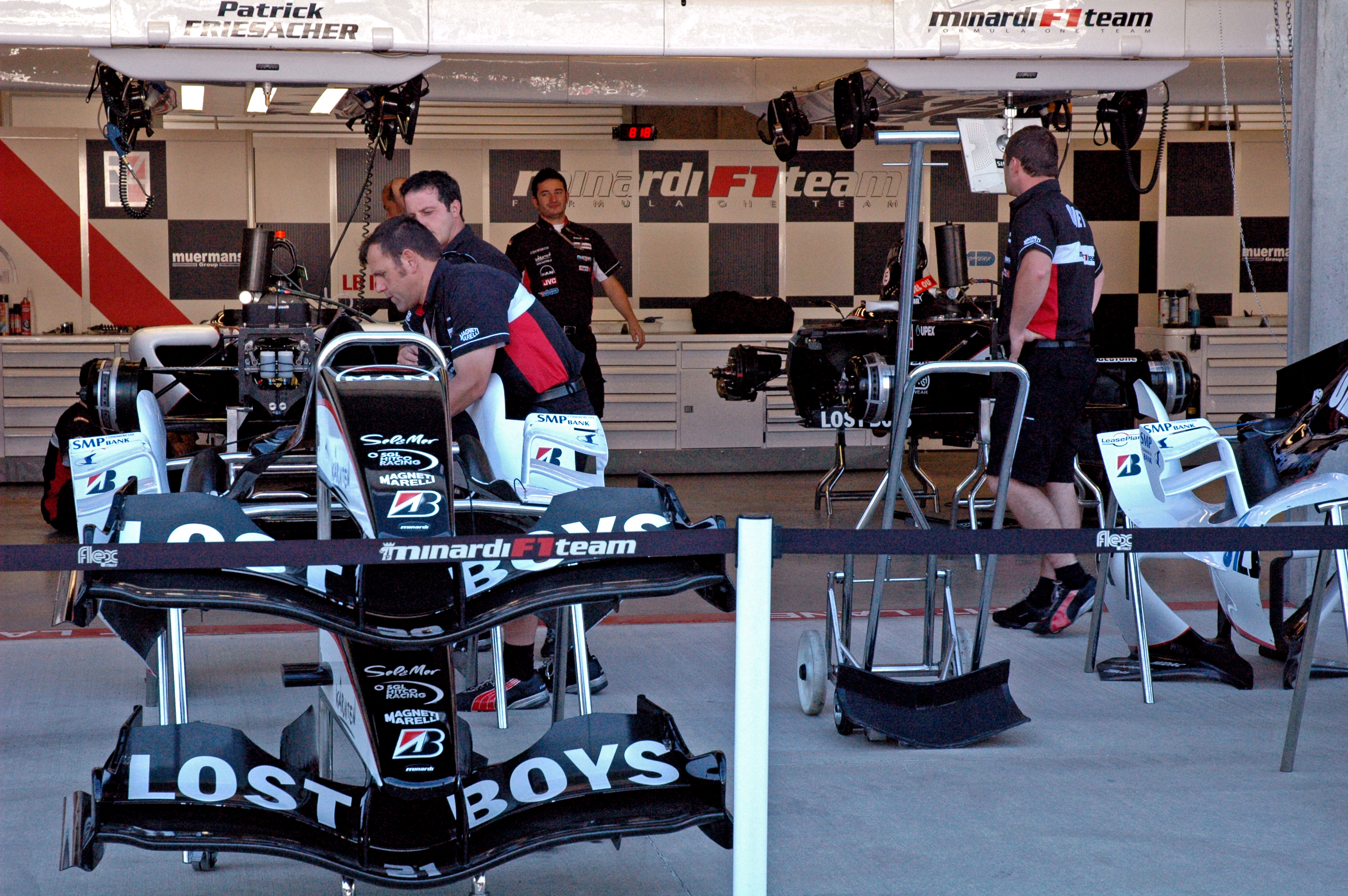 Fotografie + English: The Minardi pitlane garages at the 2005 United States Grand Prix