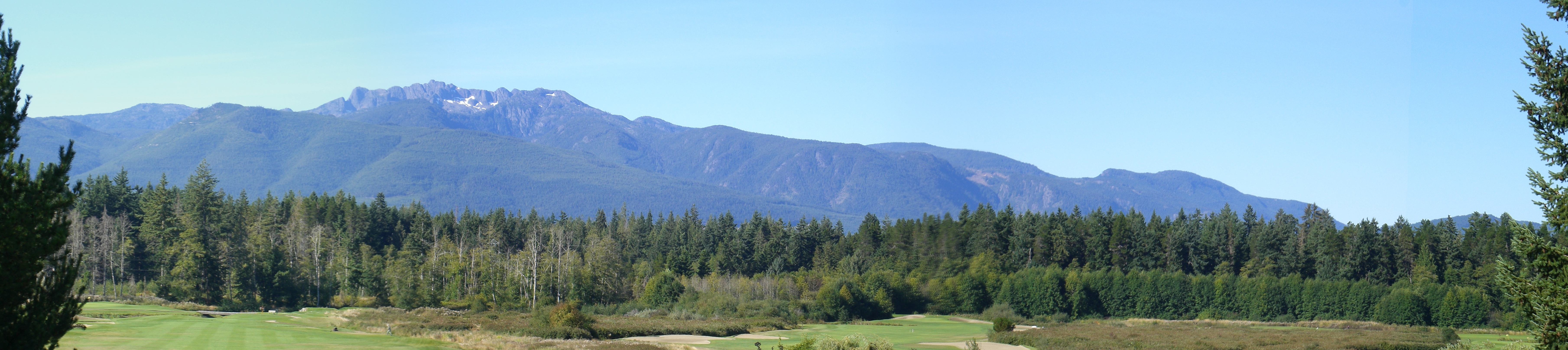 Fotografie + Description: Panorama of Mt Arrowsmith taken in the morning from Pheasant Glen Golf Resort in Qualicum Beach, BC facing South.