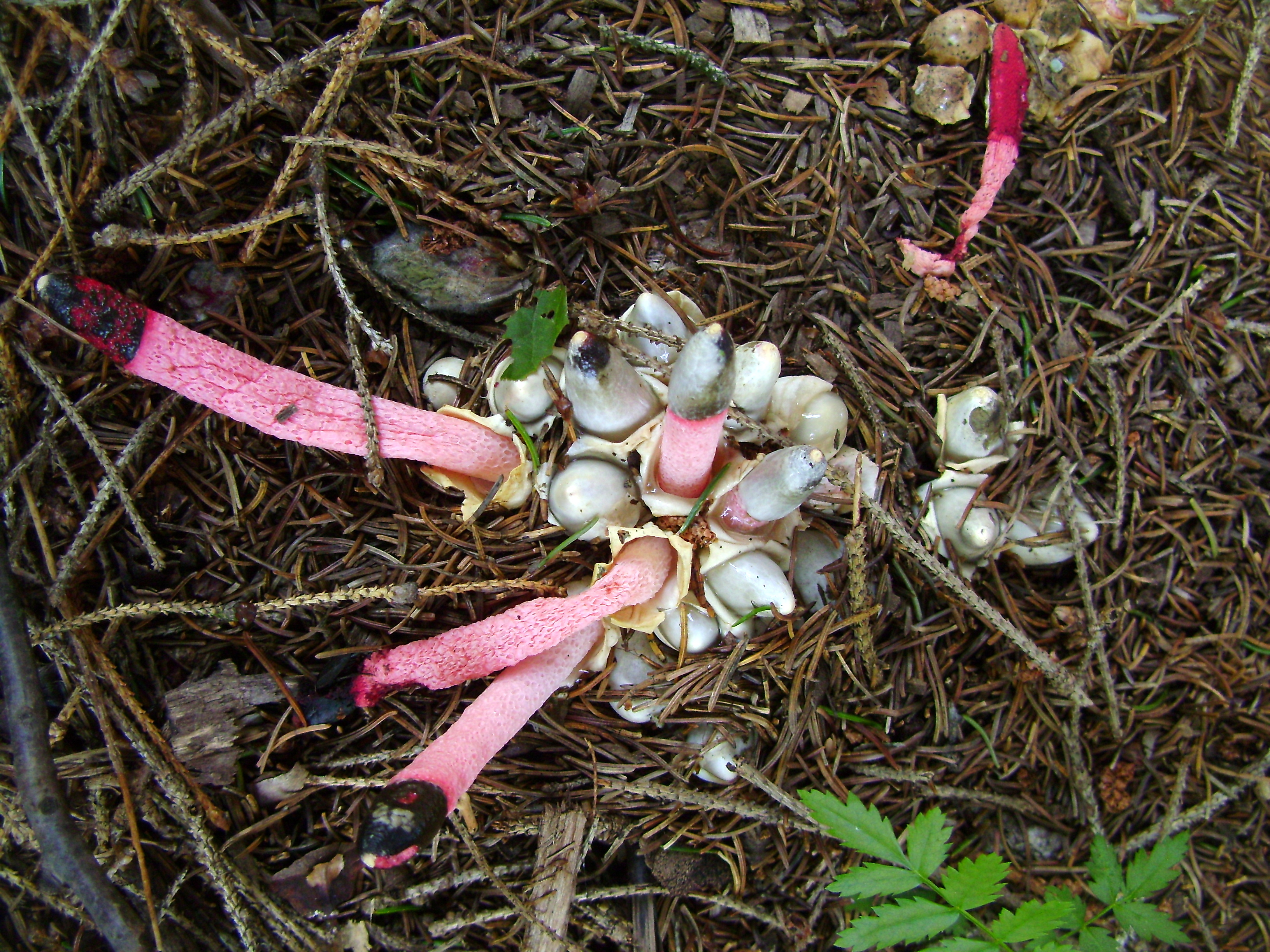 Fotografie + Français : Talle de mutins de Ravenel (Mutinus ravenelii) dans un bosquet d'épinettes blanches (Picea glauca), à Saint-Pacôme, dans le Bas-Saint-Laurent, au Québec.