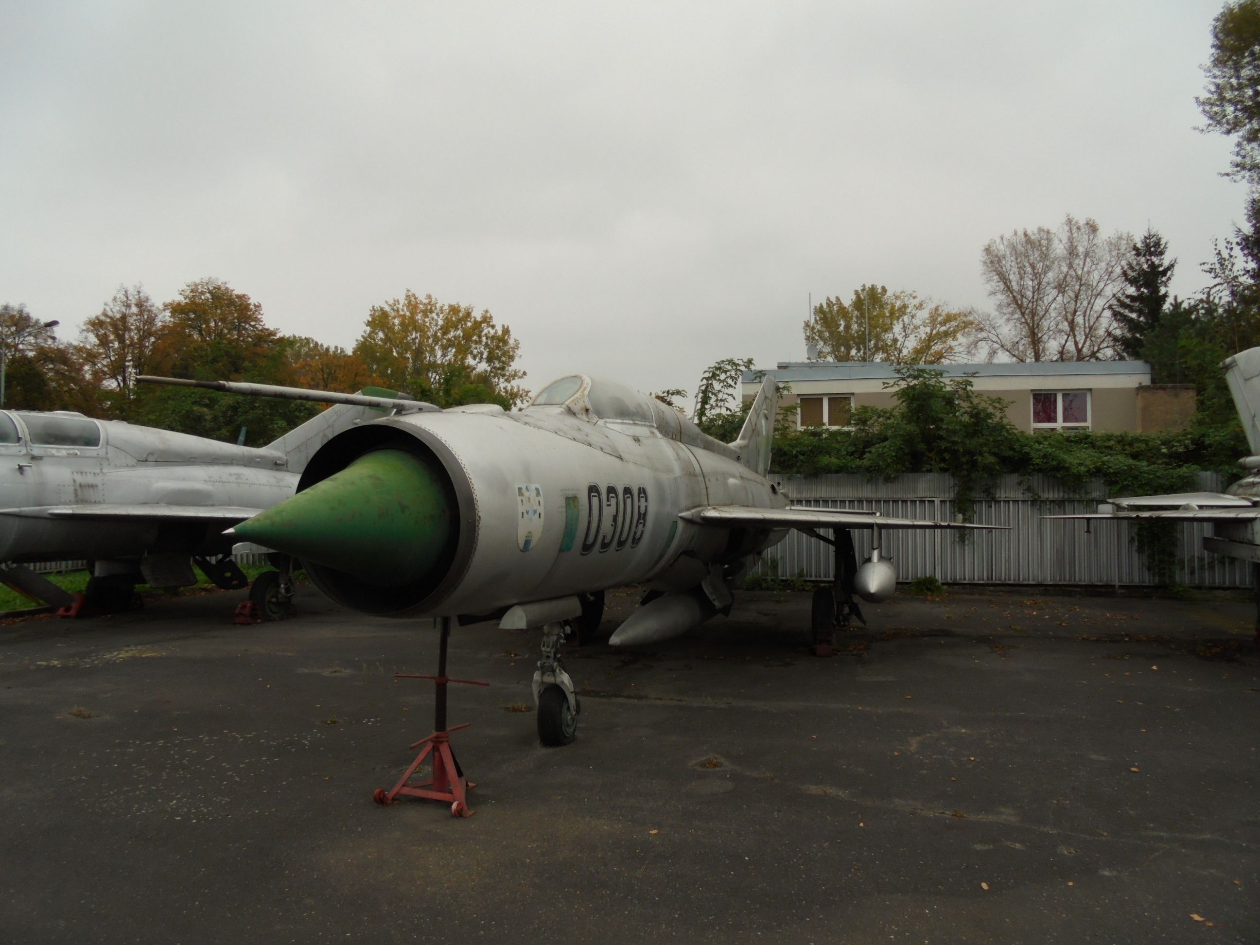 Fotografie letadla + Mikojan-Gurjevič MiG-21PF Fishbed D (ev. číslo 0308) + pochází z mého výletu do muzea civilního a vojenského letectví ve Kbelích během září 2014.