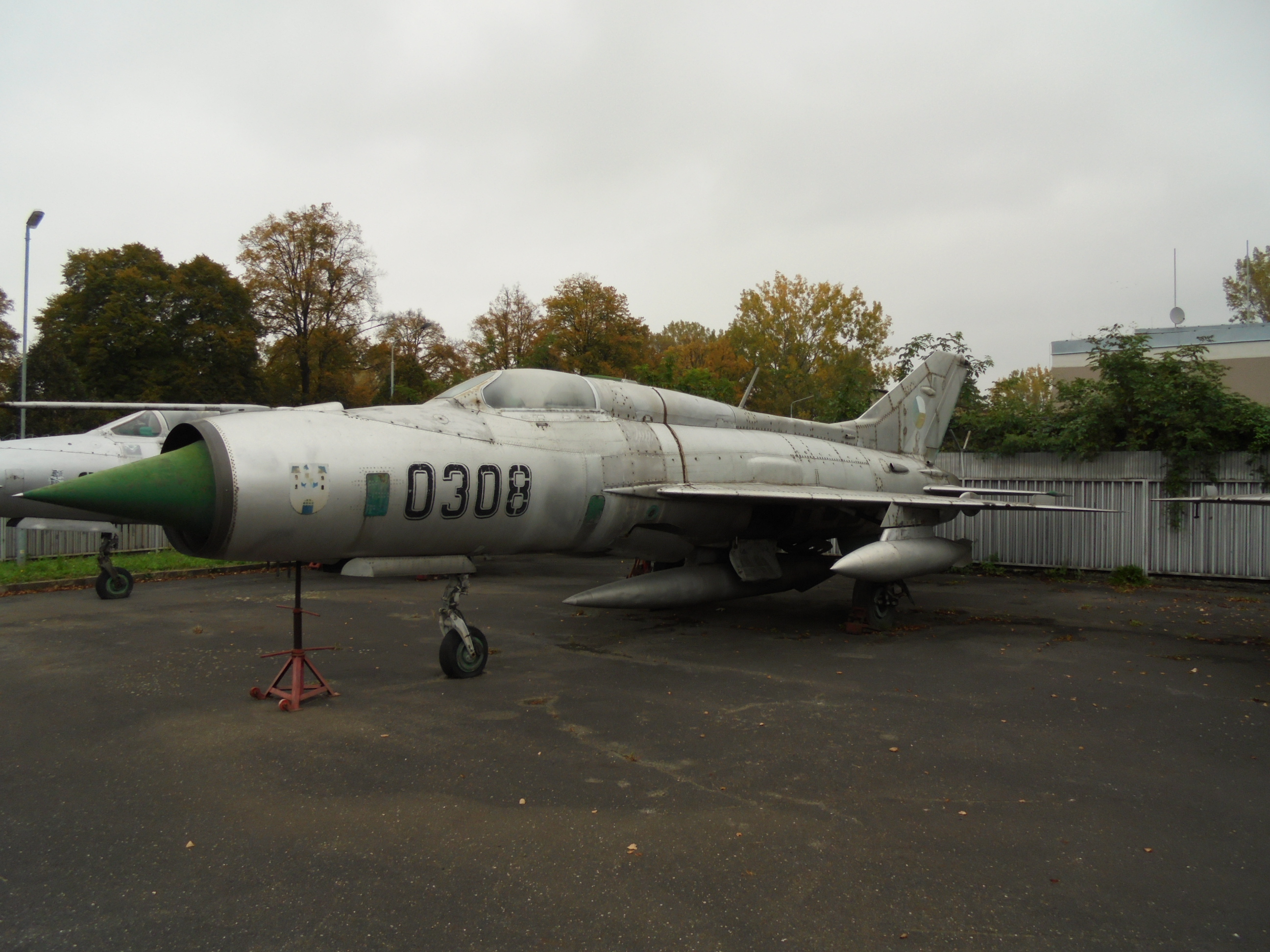 Fotografie letadla + Mikojan-Gurjevič MiG-21PF Fishbed D (ev. číslo 0308) + pochází z mého výletu do muzea civilního a vojenského letectví ve Kbelích během září 2014.