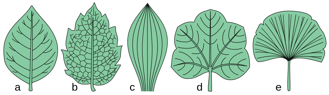 - Polski: Nerwacja liścia. Legenda: a. pierzasta, b. siatkowata, c. równoległa, d. dłoniasta, e. wachlarzowata