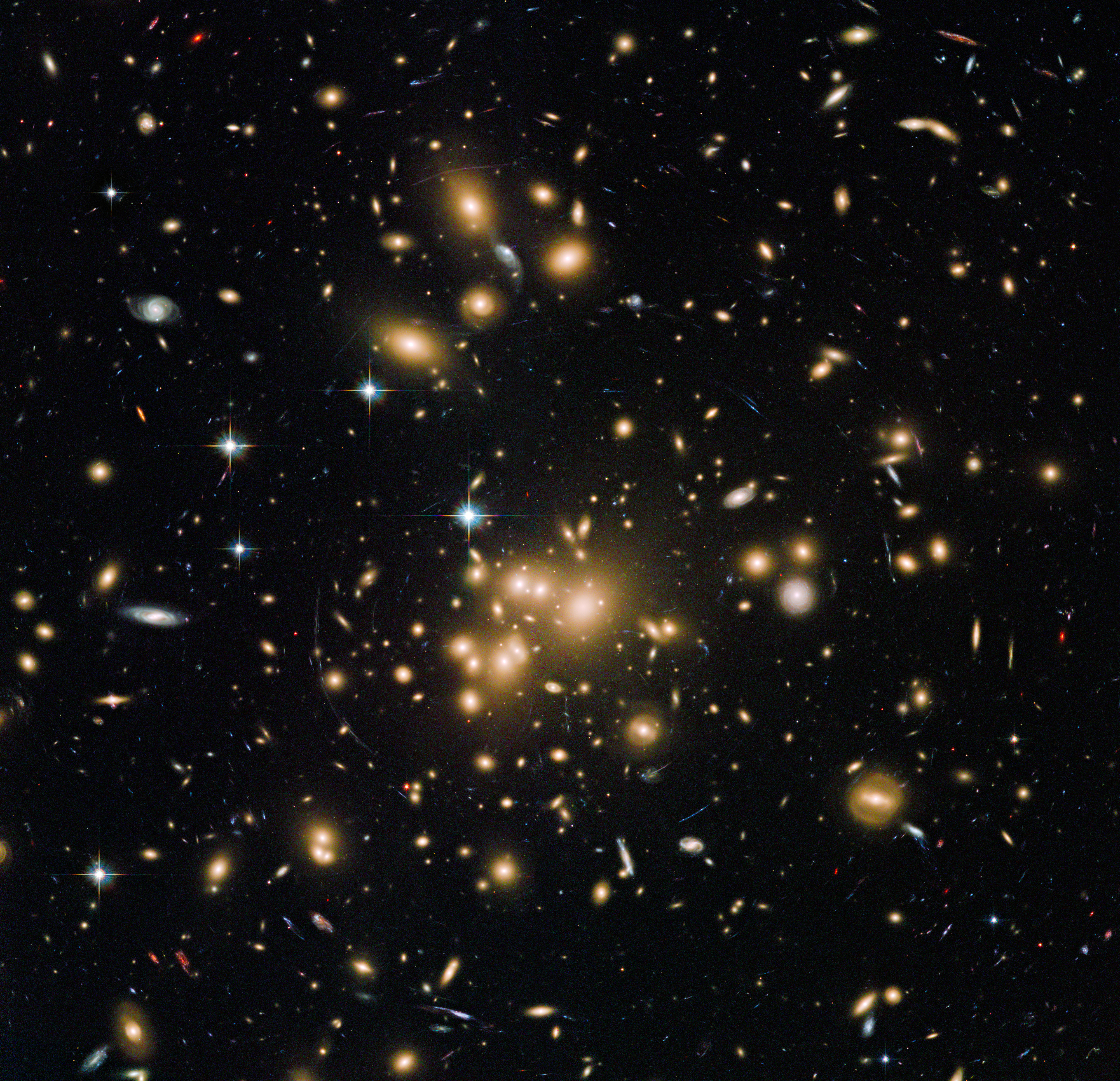 This image is peppered with glowing golden clumps, bright stars, and distant, ethereal spiral galaxies. Material from some of these galaxies is being stripped away, giving the impression that the galaxy is dripping, or bleeding, into the surrounding space. Also visible are a number of electric blue streaks, circling and arcing around the fuzzy galaxies in the centre. These streaks are the telltale signs of a cosmic phenomenon known as gravitational lensing. Abell 1689 is so massive that it bends and warps the space around it, affecting how light from objects behind the cluster travels through space. These streaks are the distorted forms of galaxies that lie behind the cluster.