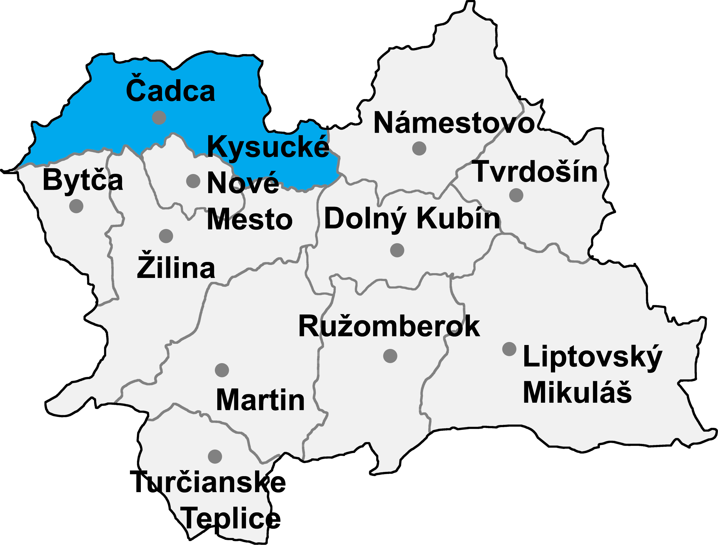 Mapa + English: map of the Žilina region (Žilinský kraj) in Slovakia, district (okres) of Čadca highlighted