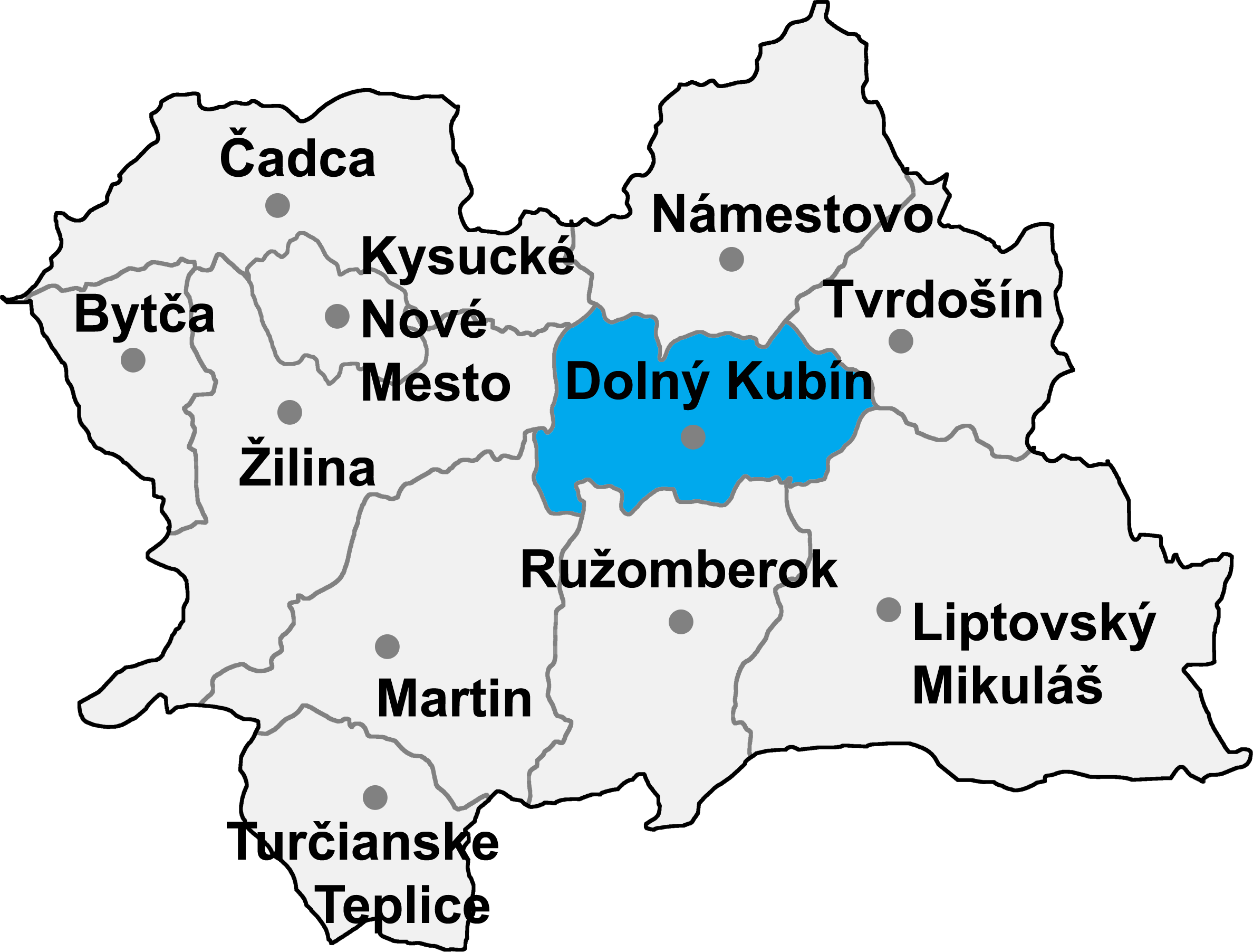 Mapa + English: map of the Žilina region (Žilinský kraj) in Slovakia, district (okres) of Dolný Kubín highlighted